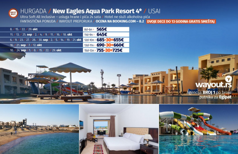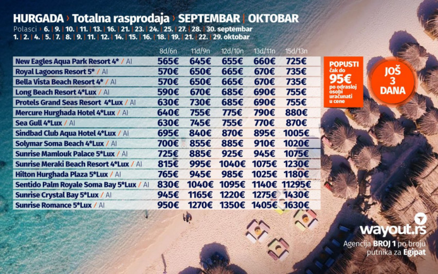 Za sve Wayout putnike obezbedili smo dodatne kapacitete u najtraženijim hotelima obzirom na to da je Hurgada ove godine jedna od najpopularnijih letnjih destinacija, a svoje "jesenje" letovanje možete rezervisati po promotivnim cenama prema Specijalnoj ponudi za polaske u septembru i oktobru, a verovali ili ne, mesta za putovanje u novembru se bukiraju velikom brzinom, samim tim savetujemo svim zainteresovanima da ukoliko žele da putuju po First Minute cenama, rezervaciju naprave što pre kako se sva mesta ne bi popunila.