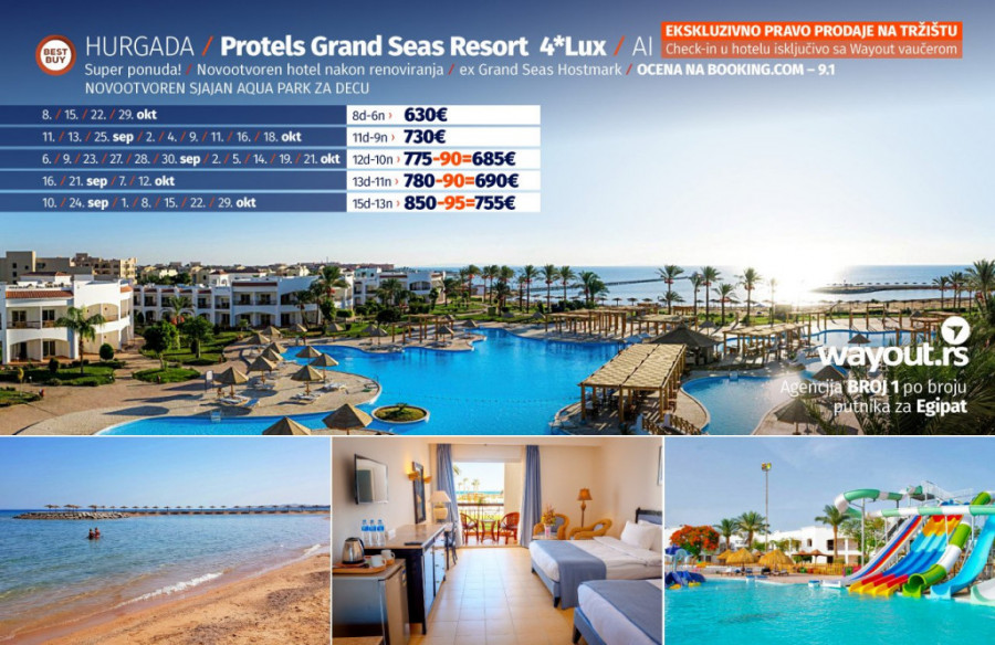 Protels Grand Seas Resort u Hurgadi ima 226 soba, rasporedenih na 2 sprata. Hotel ima fantasticnu, dugaccku, privatnu plažu gde se gosti mogu opustiti uz zvuk talasa Crvenog mora. Da bi vaš boravak bio udobniji, na raspolaganju su vam klima uredaj, frizer, mini market, lobi, prodavnice. Osoblje ovog hotela na govori nemacki, ruski, engleski, francuski i arapski. Na raspolaganju je igralište za decu kao i novootvoreni aqua park za sve uzraste. Hotel ima bazen sa slatkom vodom sa integrisanim bazenom za decu. Osvežavajuc"a pic"a se nude u baru pored bazena. Suncobrani i ležaljke su besplatni na plaži i na bazenu. Hotel je nadomak taksi stanice, kao i nedaleko od poznatog šoping centra Senzo Mall. Wayout agencija ima ekskluzivno pravo prodaje za ovaj fantastican hotel, a ulazak u hotel je dozvoljen samo putnicima sa originalnim vaucerom turisticke agencije Wayout.