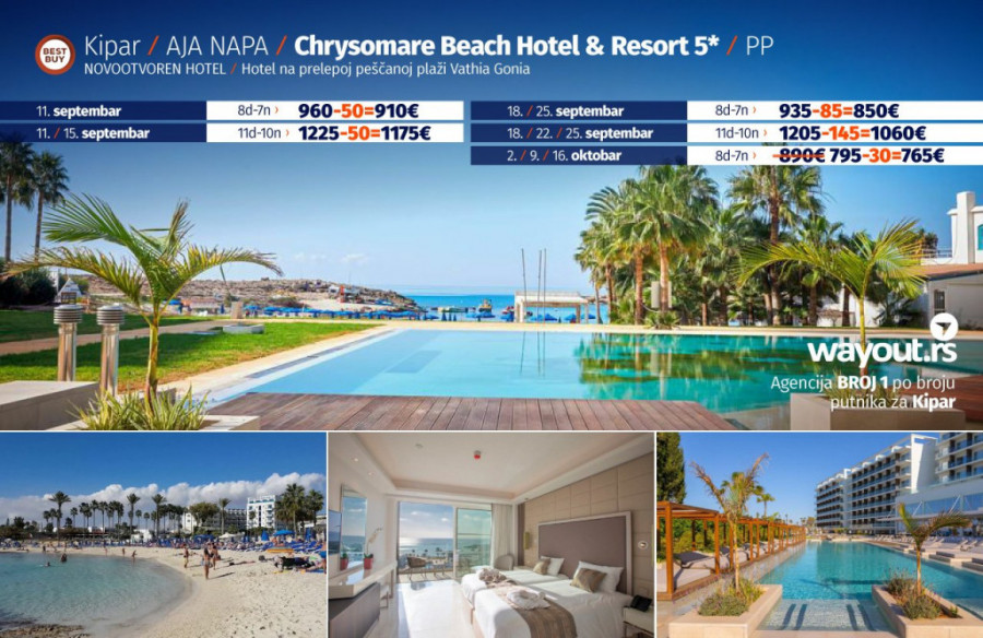 Za ovaj period godine, posebno bismo izdvojili novootvoreni hotel Chrysomare Beach koji je ove sezone pobrao sve pohvale svojih gostiju, sa posebnim akcentom na odlicnu All Inclusive uslugom koja se u Wayout agenciji obezbediti po promotivnoj ceni. Naravno, hoteli u samom centru grada uvek privlace posebnu pažnju, a od gradskih hotela bismo savetovali da se pažnja obrati na fantasticni hotel Christofinia Hotel Nissi Beach, zatim popularni Abacus Suites, kao i njegov sestrinski hotel u blizini Anmaria Beach Hotel, kao i sve traženiji Anthea Hotel Apartments.
