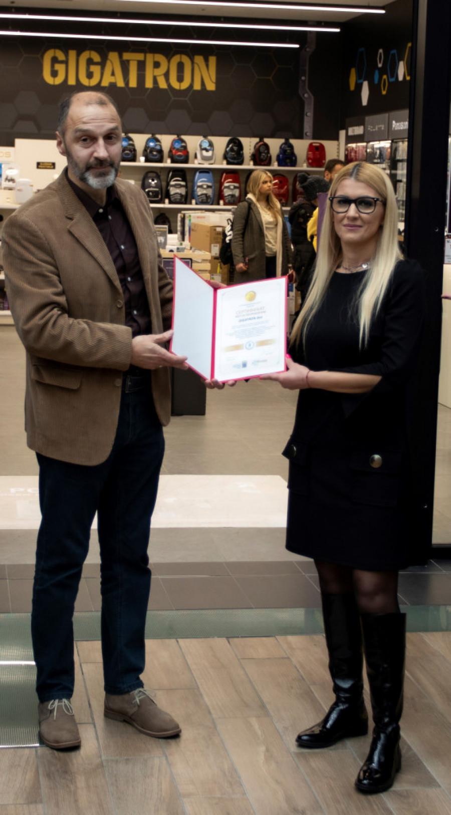 Sertifikat koji je ispred kompanije Gigatron primila izvršna direktorka Svetlana Gašić, uručio je potpredsednik Nacionalne organizacije potrošača Srbije, Zoran Nikolić.