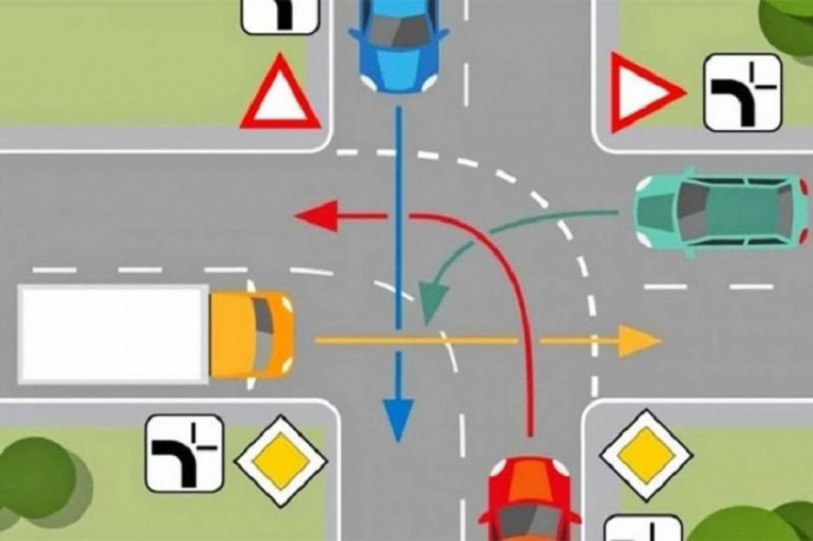 I plavi i zeleni autombil se nalaze na putu nižeg prioriteta i uključuju se na put sa pravom prvenstva prolaza, pa se na njih primenjuje pravilo desne strane. Zbog toga, prvi prolazi plavi, a za njim zeleni automobil.