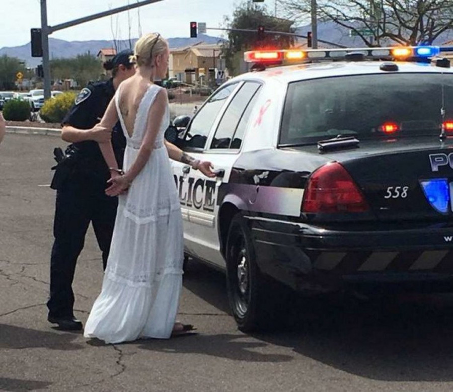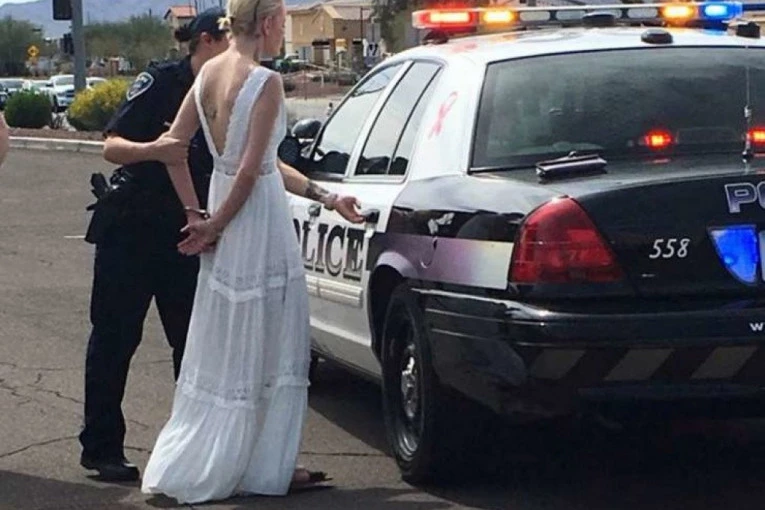Mladu obučenu u dugu belu venčanicu policajci su vezali lisicamaa nakon toga su je ugurali na zadnje sedište policijskog automobila. Srećom, u saobraćajnoj nesreći niko nije teže povređen, osim verovatno ega mladoženje koji je ostao da čeka pred oltarom.