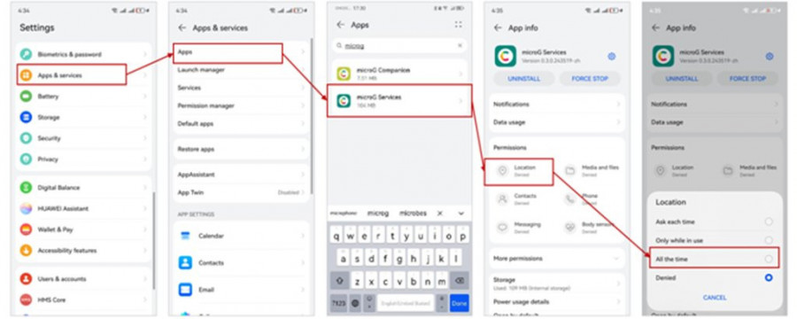 Ukoliko naiđete na probleme prilikom korišćenja aplikacija na svom Huawei uređaju, potrebno je da u podešavanjima izaberete sekciju Apps, zatim u pretragu ukucate "microg" i pronađete microG Services. Izaberite sekciju "Location" i kliknite na opciju "All the time".