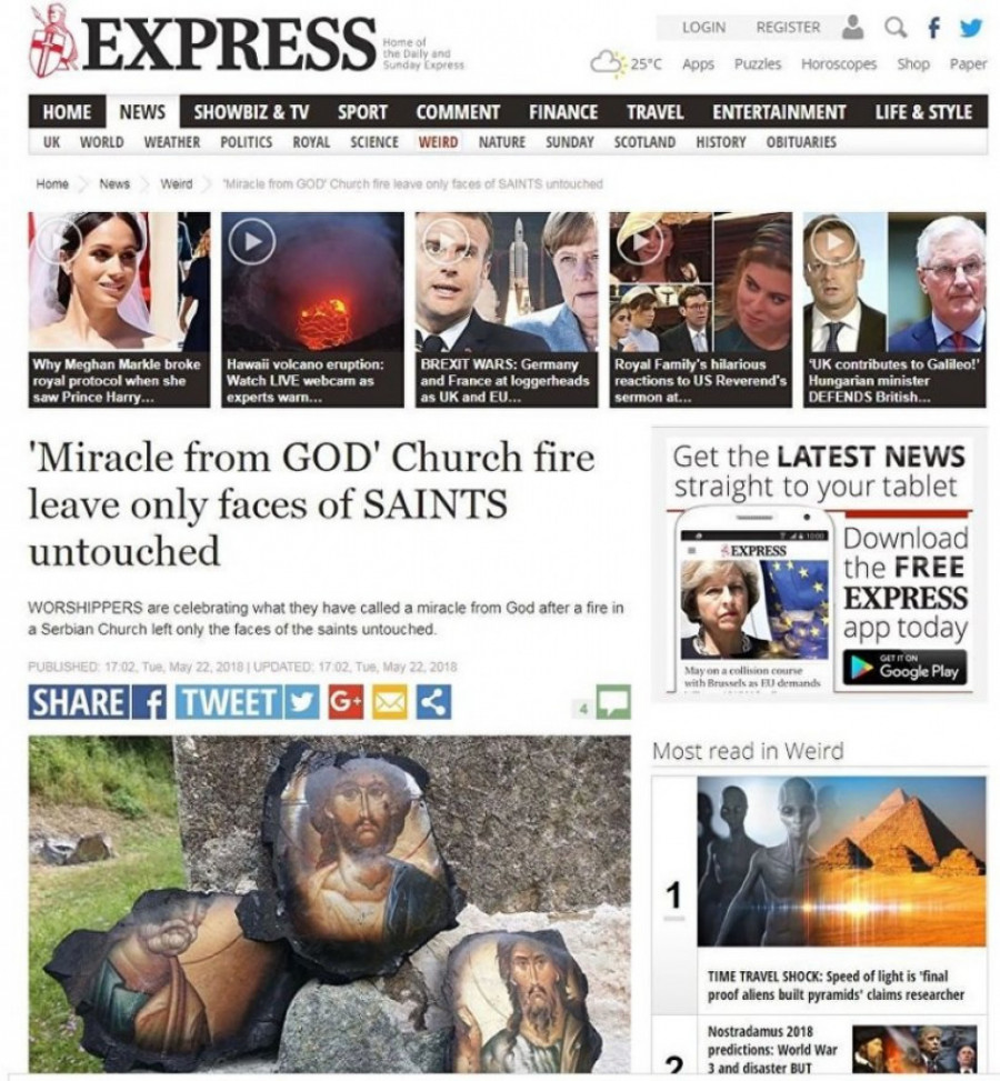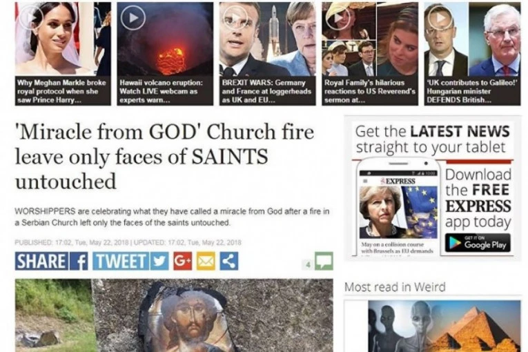 Engleski Dejli ekspres objavio je priču o čudu kod Vladičinog Hana, o požaru koji je progutao sve osim slike svetaca.