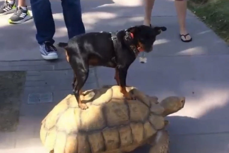 Jedan pas rešio je da odmara "za sve pare" na letovalištu, pa je tako došao na ideju da ne mora ni noge da koristi, pa se popeo na ogromnu kornjaču koja ga je vodila tamo gde je hteo. Pogledajte urnbesan snimak...