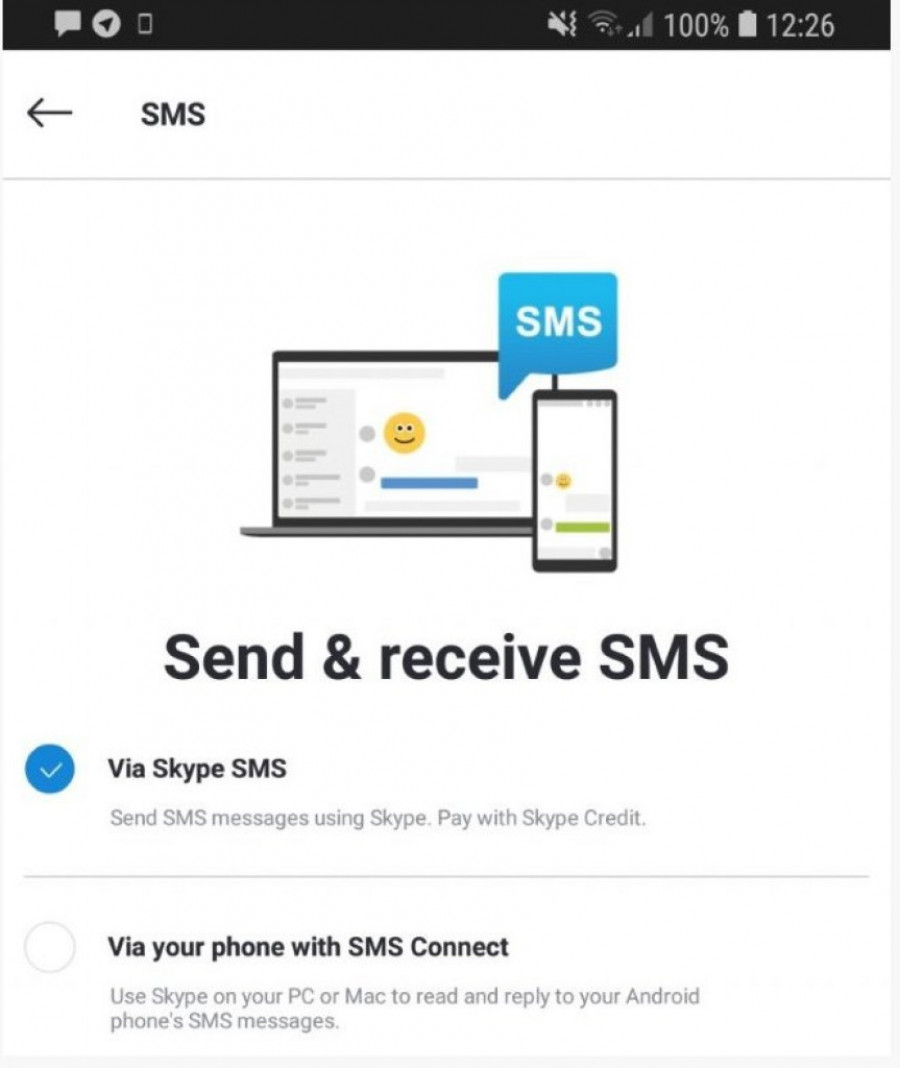 druga opcija je slanje SMS-a korišćenjem SMS Connect funkcije, koja će kao podrazumevanu SMS aplikaciju podesiti Skyšpe i omogućiće primanje i slanje SMS poruka na desktopu preko Skype aplikacije.