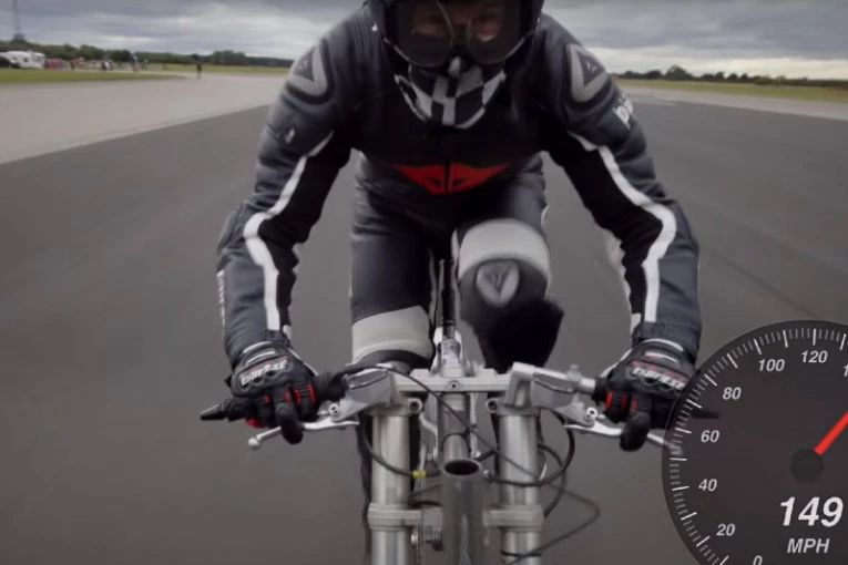 Foto: Printskrin: youtube.com/Adam RobertsKembel, čiji je prethodni najbolji rezultat u ovoj disciplini iznosio 217 km/h, koristio je specijalno konstruisan bicikl firme Moss bajks, dizajniran za brzine do čak 322 km/h.
