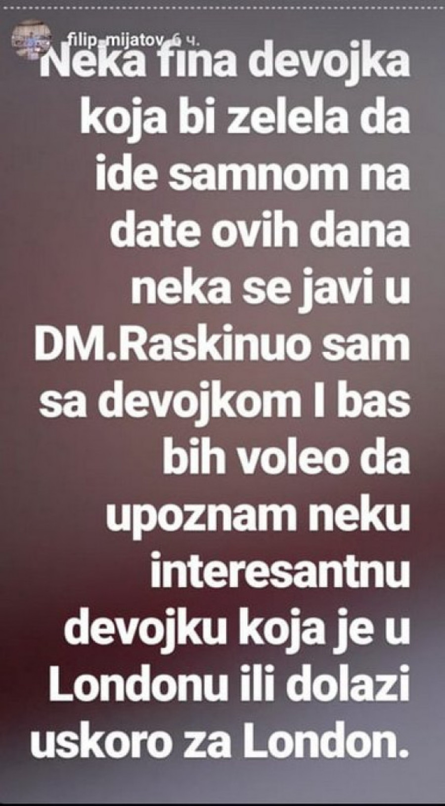 - Neka fina devojka, koja bi želela da ide sa mnom na dejt ovih dana neka se javi u DM. Raskinuo sam sa devojkom i baš bih voleo da upoznam neku interesantnu devojku koja je u Londonu ili uskoro dolazi za Londom - glasila je njegova poruka na Instagramu.