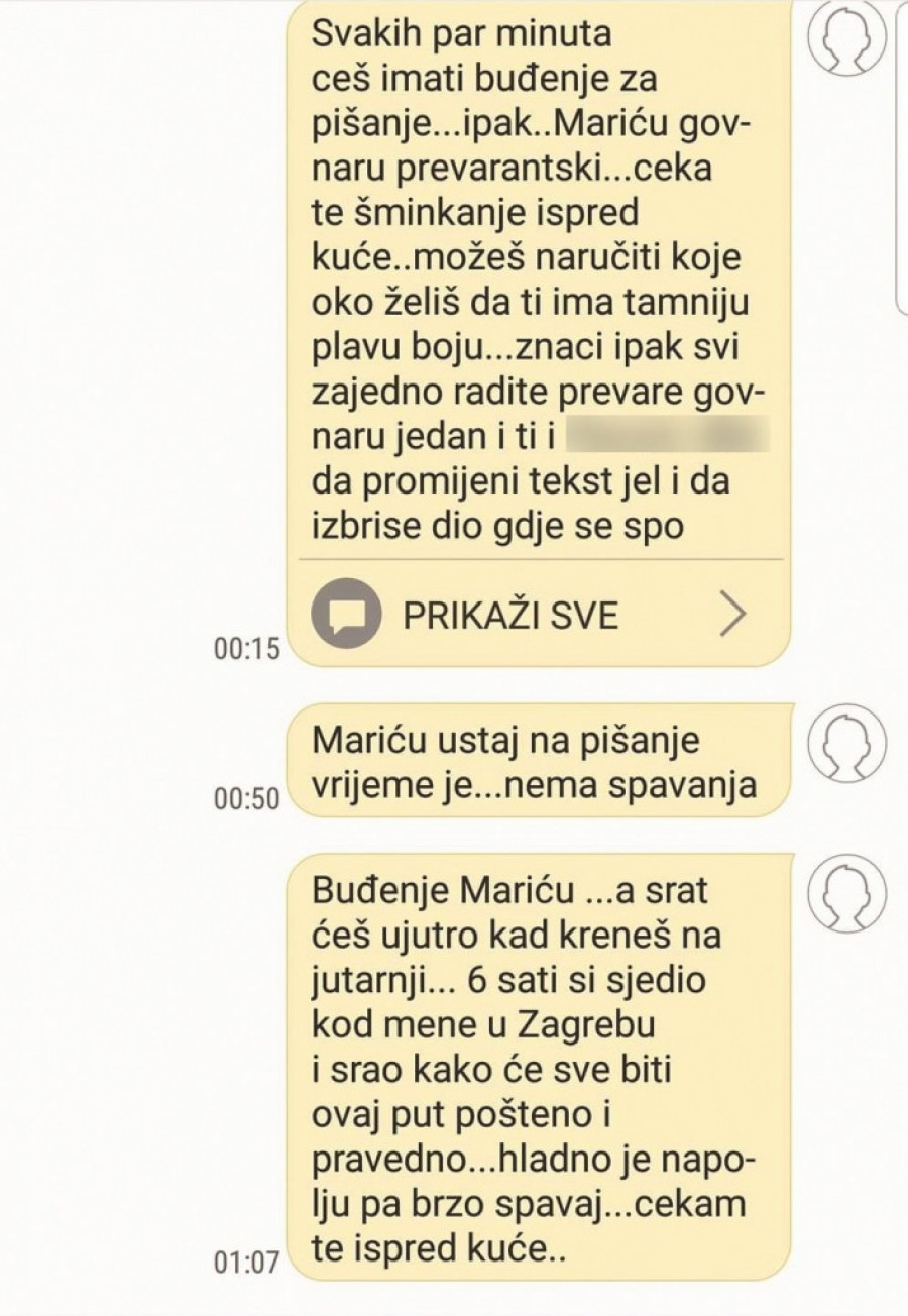 - Slušaj, Mariću, majmune jedan, je l' ti treba da ti polomim ruke i noge. Treba li ti to. Pizdo jedna obična govnarska! Sad mi te dosta! Sad sam ja na potezu! Pazi se kad ideš na jutarnji i kad se vraćaš kući. Ozbiljna sam!!! Pare danas u 20.17. Tu sam ti ispred kuće i čekam te dok ne kreneš na posao. Opušteno, naspavaj se dobro.