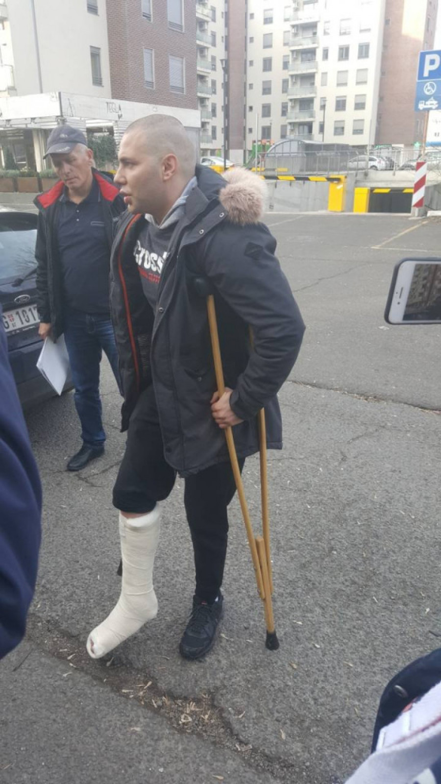 Ispred Osnovnog suda Brendon je došao sa nogom u gipsu, šepajući, u štakama. Došao je u pratnji svog oca.