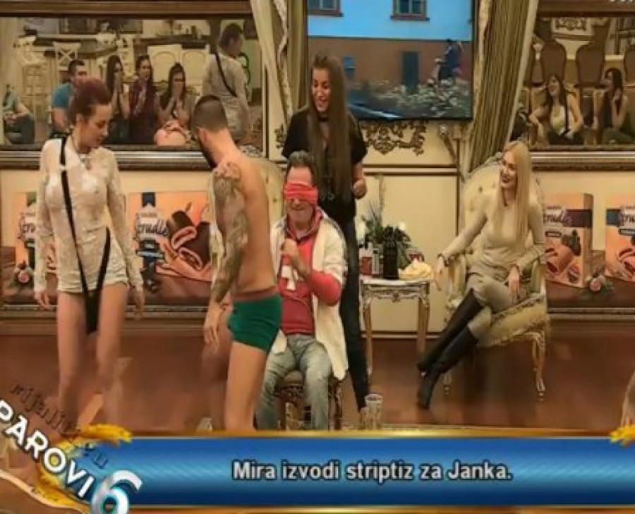 Naime, on je sedeo na stolici, a ispred njega je stala Mirjana Praizović i počela da izvodi striptiz. Dalila je Janku prekrila oči, a dok mu je Mirjana igrala pred nosem, on ju je pipkao po nogama i grudima.