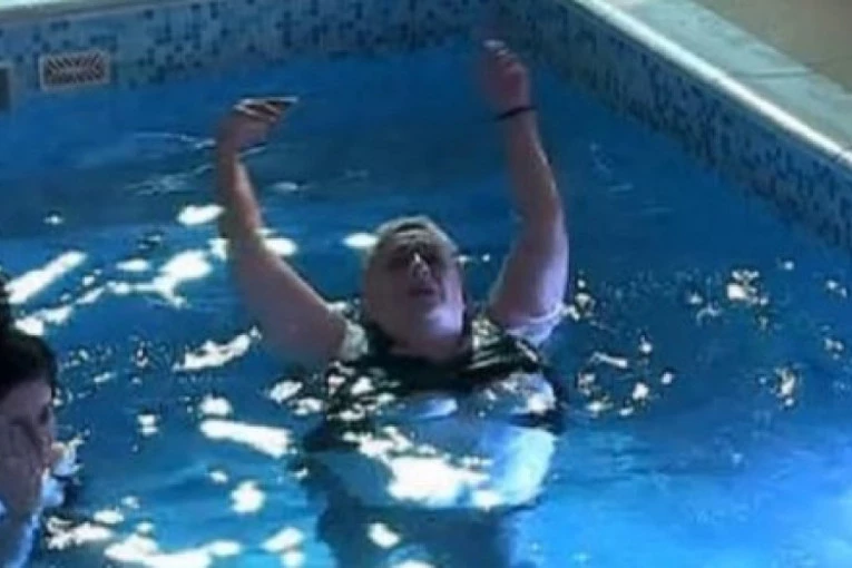 Mirno kupanje u bazenu poremetila je Rivasova koja je ušla i momnentalno zaigrala. I kako joj nije pošlo za rukom da pažnju privuče činjenicom da se kupa obučena odlučila se, očigledno, za drugu opciju.