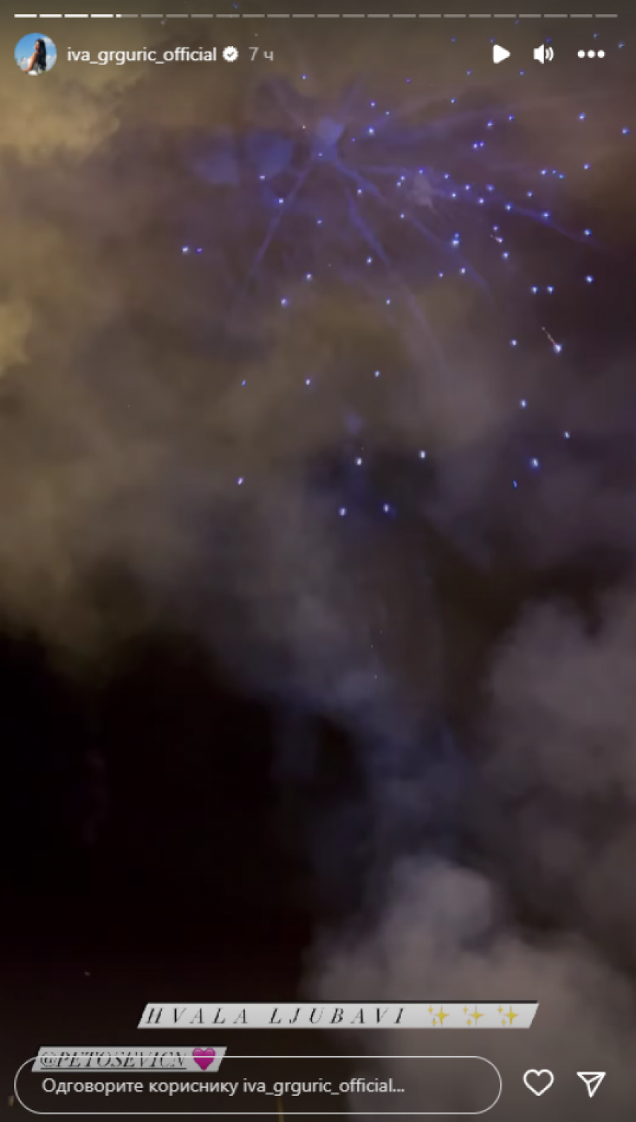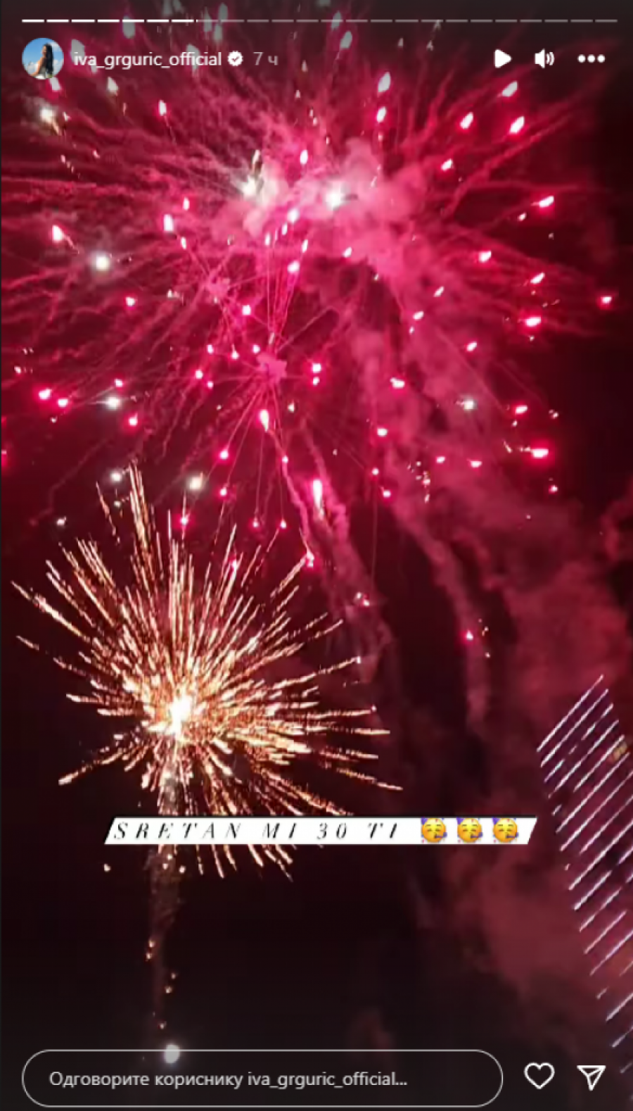 Iva je sinoć u ponoć napunila 30 godina, a Nemanja joj je priredio romantično iznenađenje. Osim večere u jednom poznatom prestoničkom restoranu, gde je uživala u đakonijama i šampanjcu, Iva je dobila i spektaluaran vatromet, koji je obasjao nebo iznad Kule Beograd. Grgurićeva je ovo iznenađenje podelila sa svojim pratiocima na društvenoj mreži Instagram.