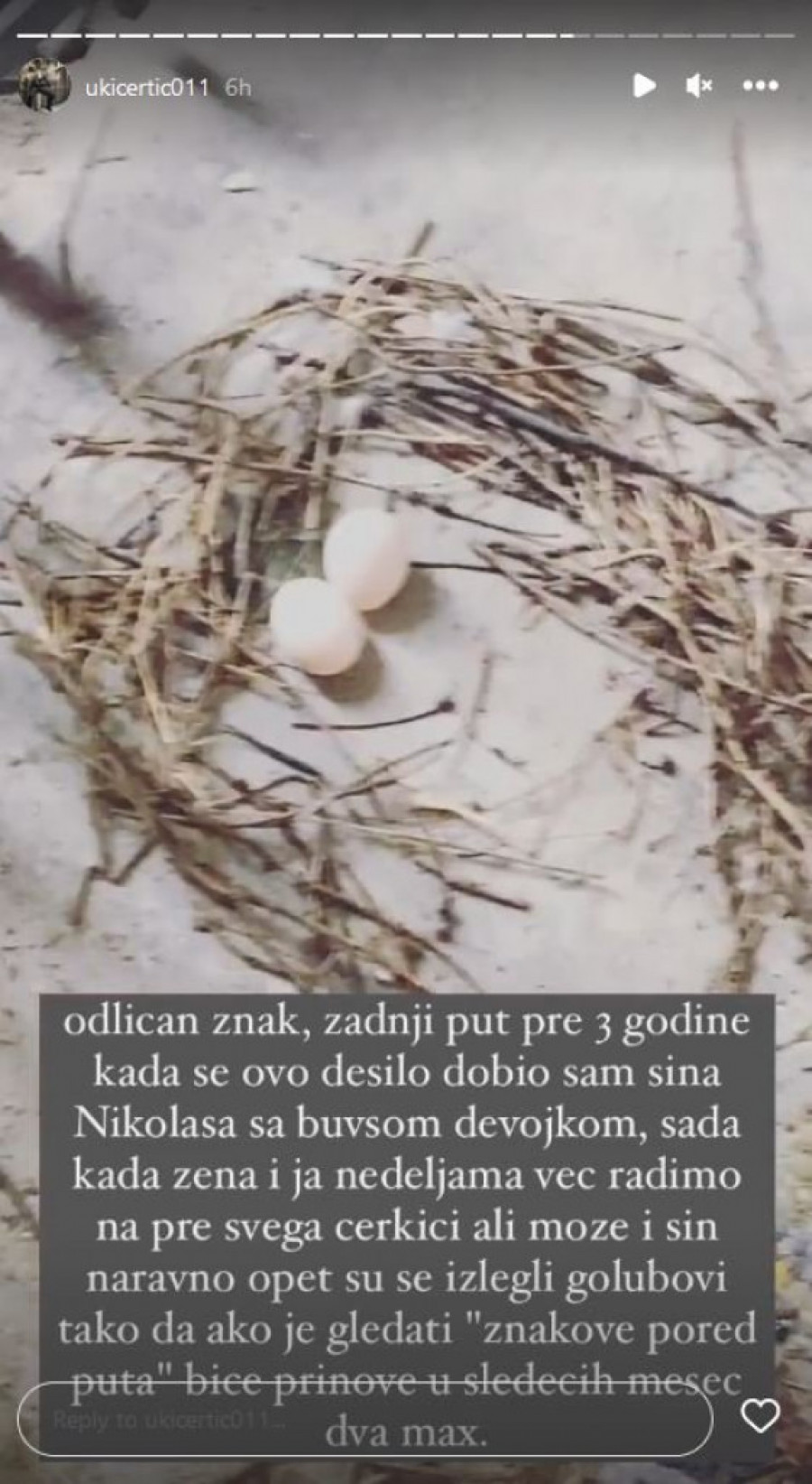 - Odličan znak, poslednji put pre tri godine kad se ovo desilo, dobio sam sina Nikolasa sa bivšom devojkom, sad kad žena i ja nedeljama već radimo, na pre svega ćerkici, ali može i sin naravno, opet su se izlegli golubovi. Tako da, ako je gledati "znakove pored puta", biće prinove u sledeći mesec, dva maks - napisao je Uroš.