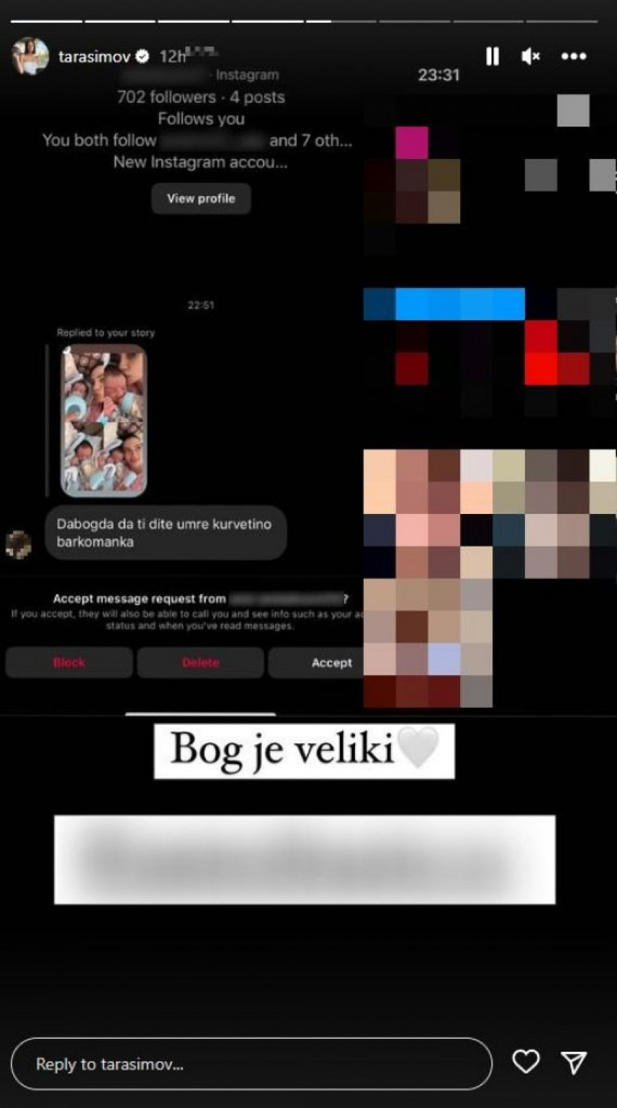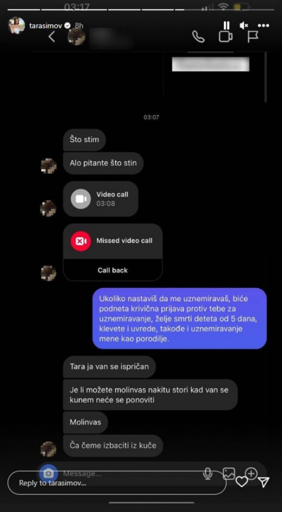 - Ukoliko nastaviš da me uznemiravaš, biće podneta krivična prijava protiv tebe za uznemiravanje, želje smrti deteta od 5 dana, klevete i uvrede, takođe i uznemiravanje mene kao porodilje - odgovorila mu je Tara.