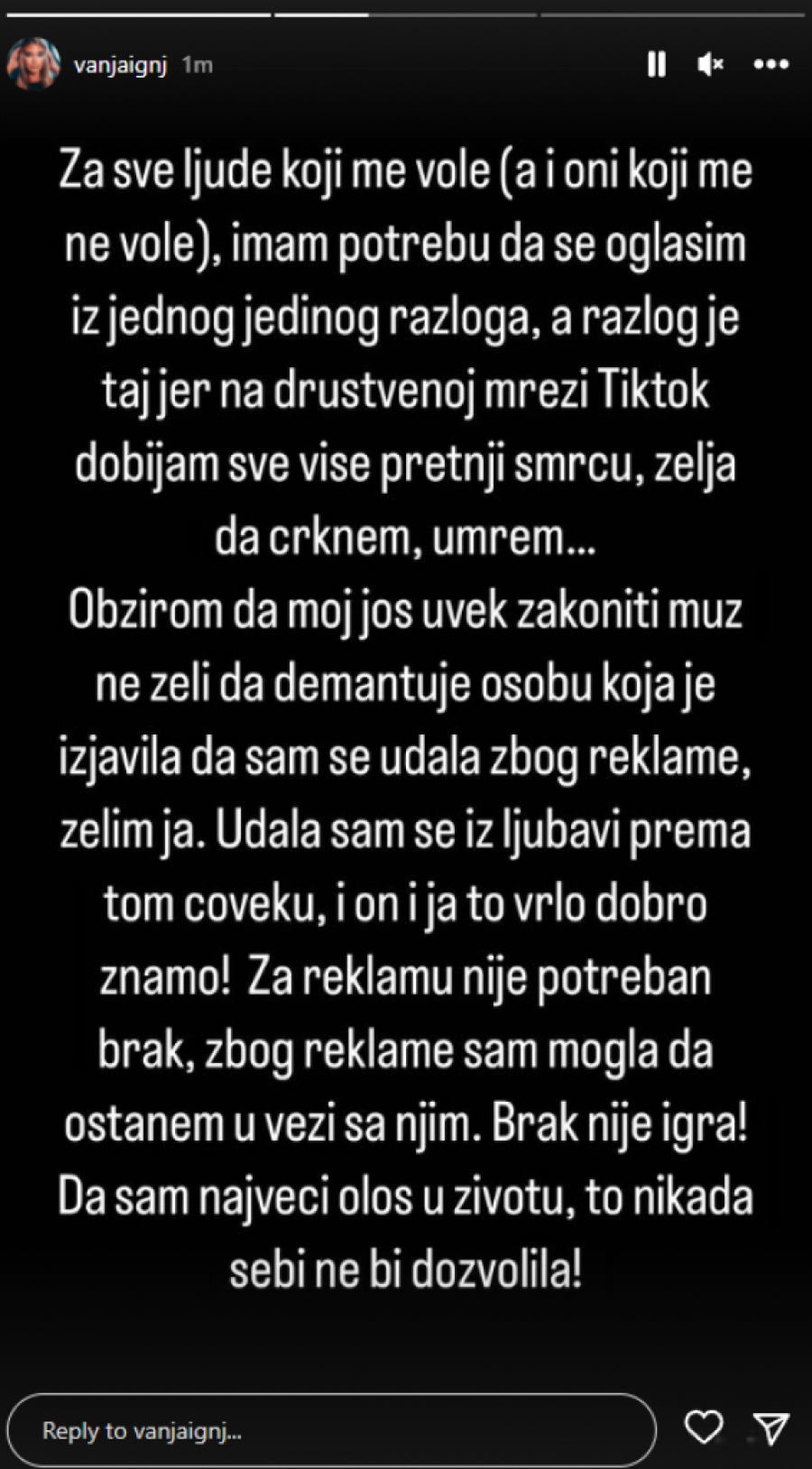 - Morala sam da se oglasim, zbog toga što na TikToku neprestano dobijam pretnje smrću. Moj muž ne želi da demantuje osobu, koja je rekla da sam se udala zbog reklame, tako da to moram učiniti ja. Nije bilo potrebe da se udam zbog reklame, udala sam se iz ljubavi prema tom čoveku i to znamo oboje - počela je Vanja, pa odmah nastavila: