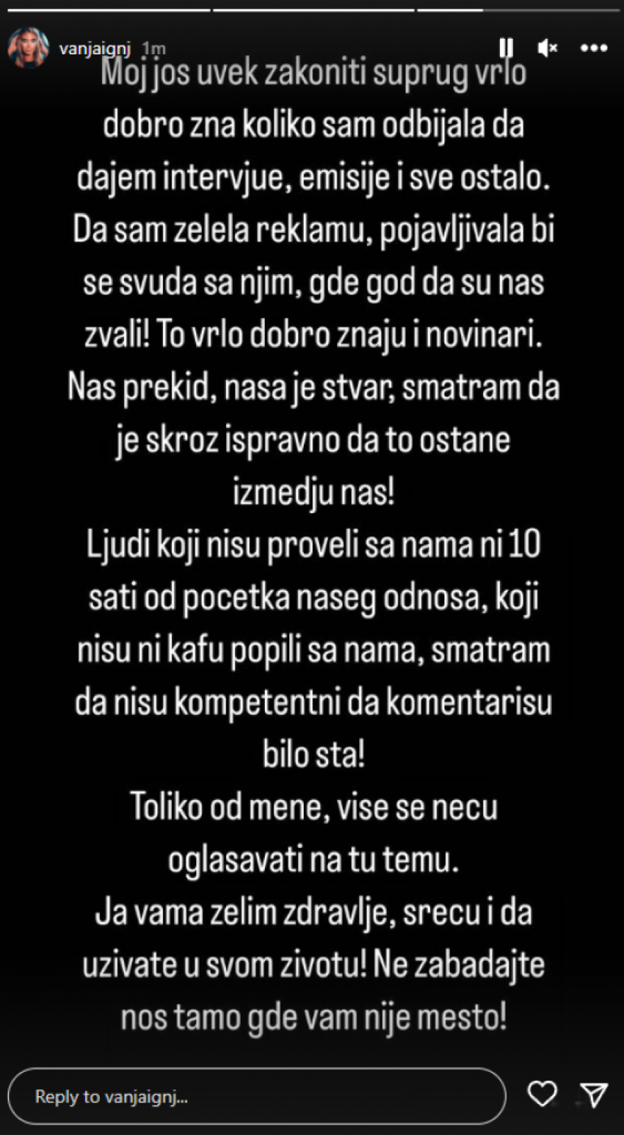 - On zna da sam ja uvek odbijala da dajem izjave i radim intervjue, da sam želela reklamu, svuda bih se pojavljivala sa njim. Osobe koje nisu sa nama provele ni deset dana, nisu kompetentne da pričaju o našem odnosu - napisala je Vanja.