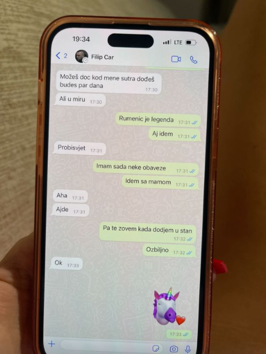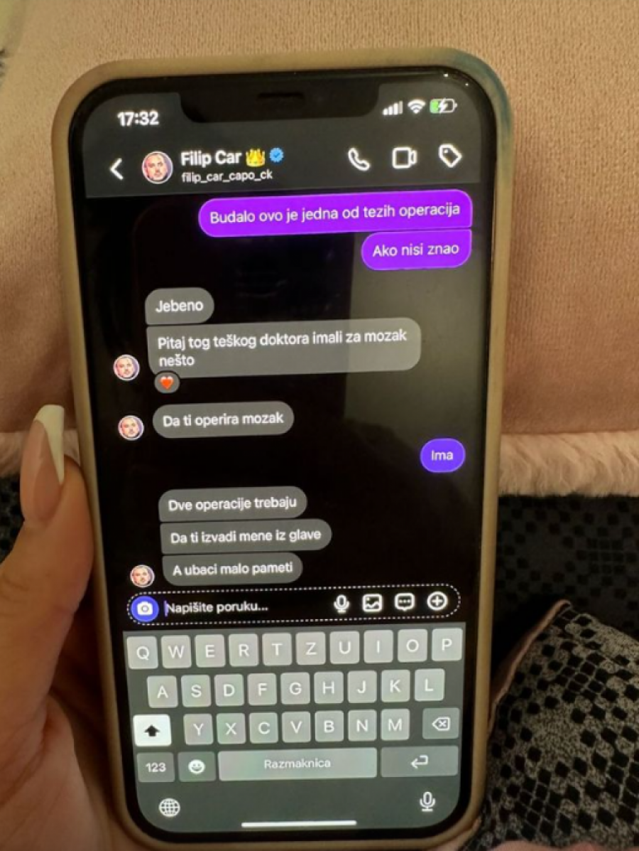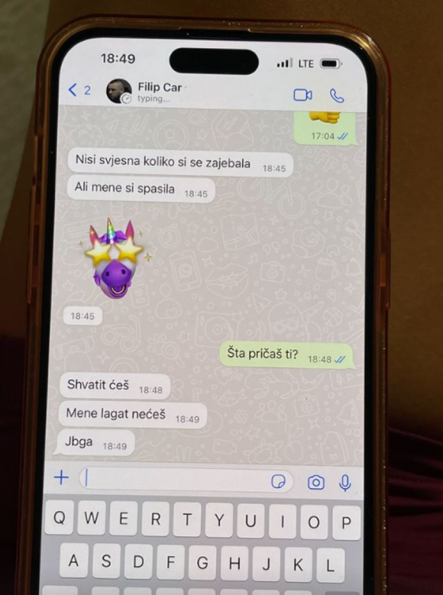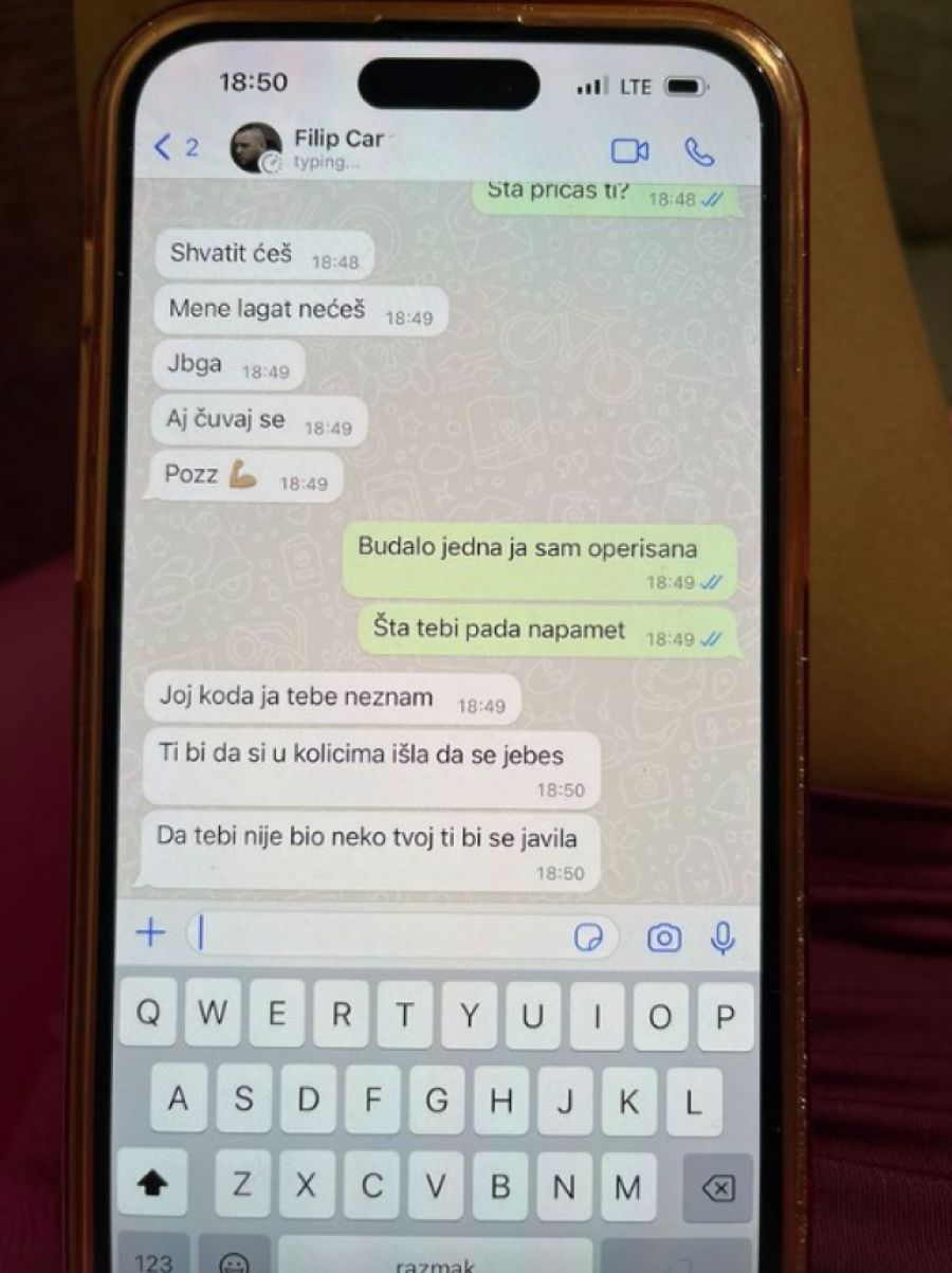 - Nisam ti ja neki tamo, meni fore sa pijace ne prolaze. Ti dobro mene znaš. Nebitno, moja greška. Lep pozdrav. Nisi svesna koliko si se zaj*bala, a mene si spasila. Shvatićeš, mene lagati nećeš. Aj čuvaj se, pozdrav - napisao je Car Maji u nekoliko poruka, a ona mu je odgovorila da je operisana, pa je jasno da joj je pravio ljubomornu scenu i imao sumnju.