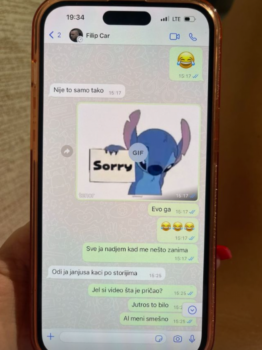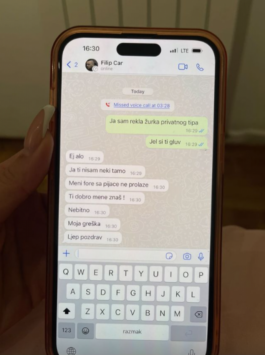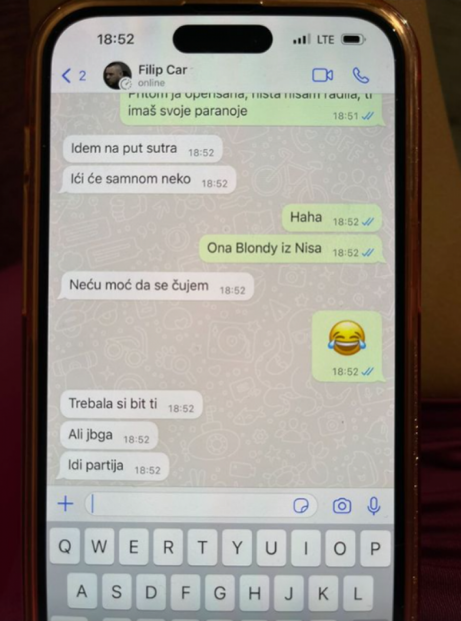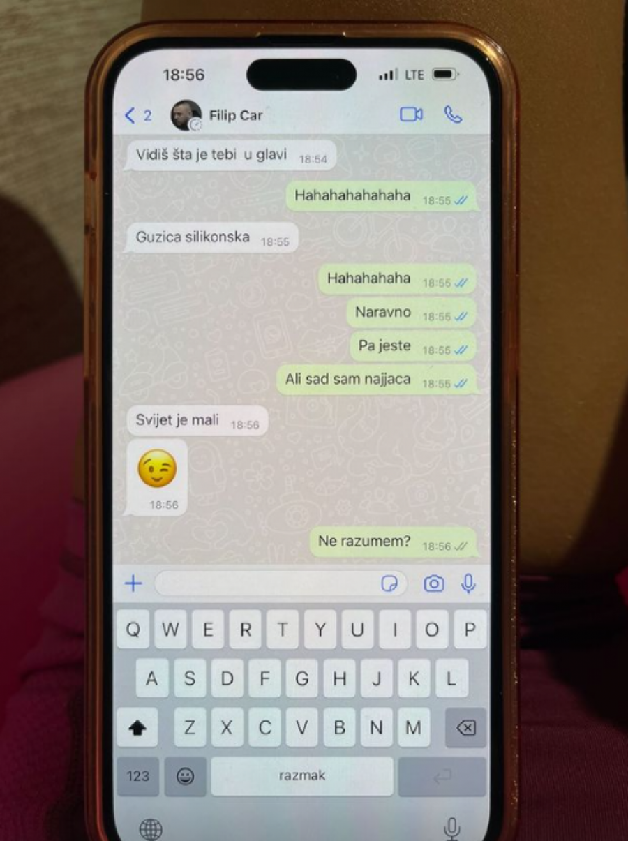 - Nisam ti ja neki tamo, meni fore sa pijace ne prolaze. Ti dobro mene znaš. Nebitno, moja greška. Lep pozdrav. Nisi svesna koliko si se zaj*bala, a mene si spasila. Shvatićeš, mene lagati nećeš. Aj čuvaj se, pozdrav - napisao je Car Maji u nekoliko poruka, a ona mu je odgovorila da je operisana, pa je jasno da joj je pravio ljubomornu scenu i imao sumnju.