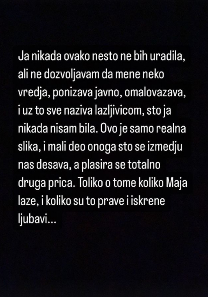 - Ja nikad ovako nešto ne bih uradila, ali ne dozvoljavam da mene neko vređa, ponižava javno, omalovažava i uz to sve naziva lažljivicom, što ja nikad nisam bila. Ovo je samo realna slika, i mali deo onoga što se između nas dešava, a plasira se totalno druga priča. Toliko o tome koliko Maja laže i koliko su to prave i iskrene ljubavi - poručila je Maja putem svog Instagram profila nakon svih poruka koje je objavila.