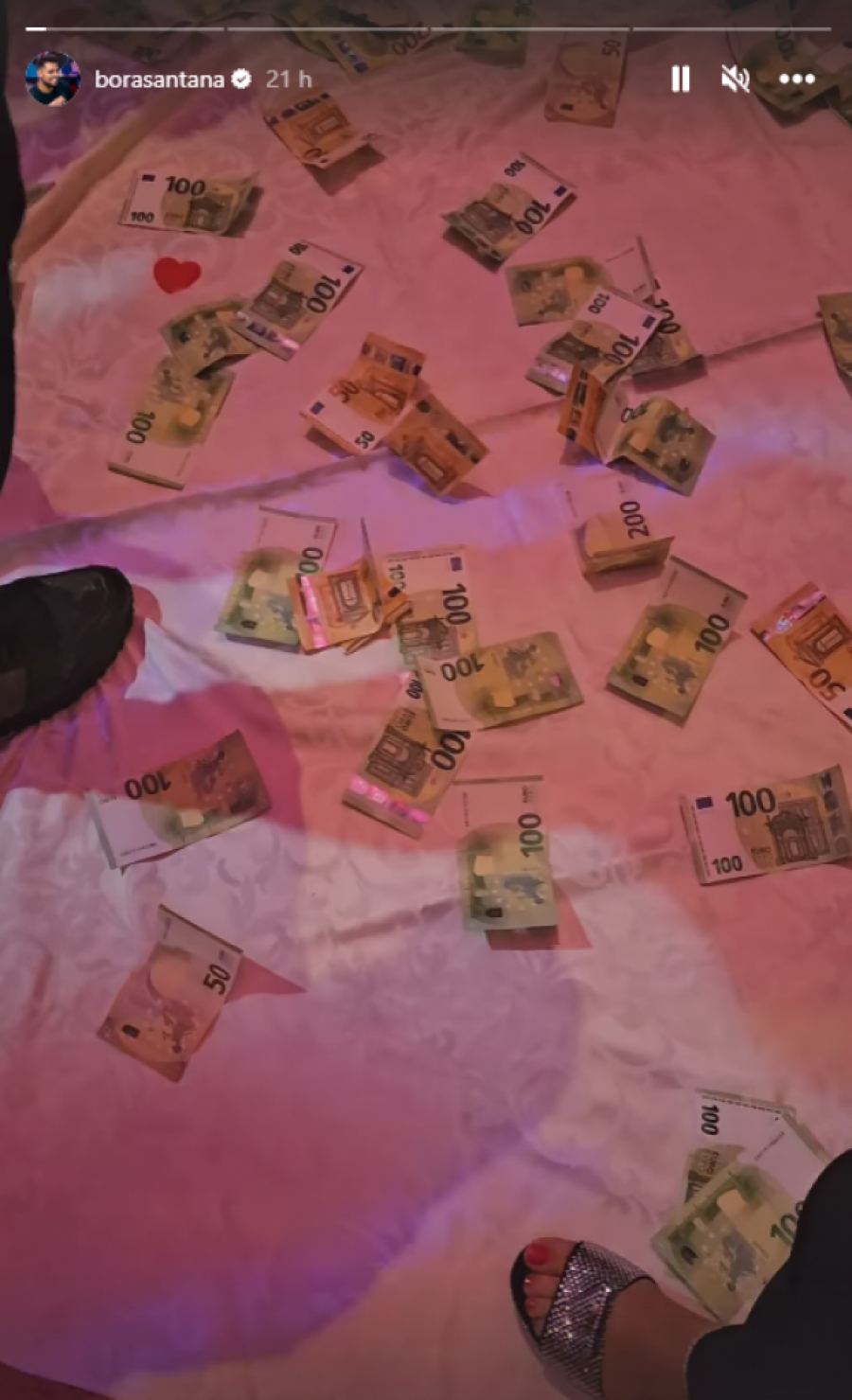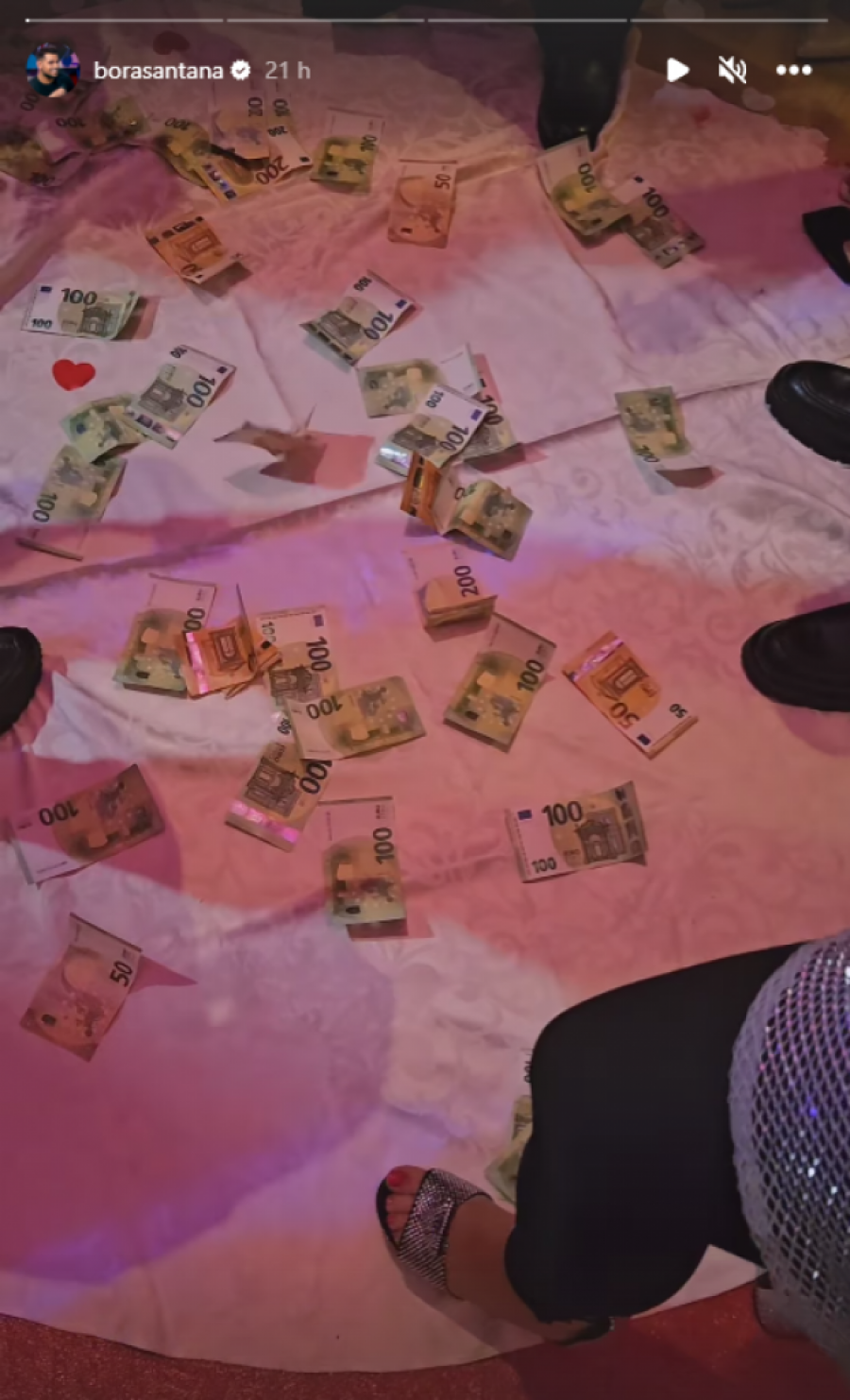 Poznati voditelj i pevač Bora Santana nedavno je objavio video na svom Instagram profilu koji je privukao veliku pažnju. Na snimku se vidi kako su novčanice od 100 evra razbacane svuda po podu na jednom privatnom veselju. Atmosfera je bila euforična, a novac je doslovno leteo kroz vazduh.