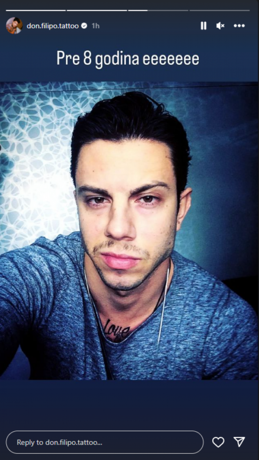 On je na svom profilu prvo podelio svoj selfi od pre osam godina, gde nije imao tetovaže, po kojima je danas prepoznatljiv, imao je dužu kosu i stajling mu je bio drugačiji. Međutim, mnogi komentarišu da se nije mnogo promenio i da mu se na licu ne vidi da je ostario osam godina, iako je bez svojih zaštitnih znakova po telu.