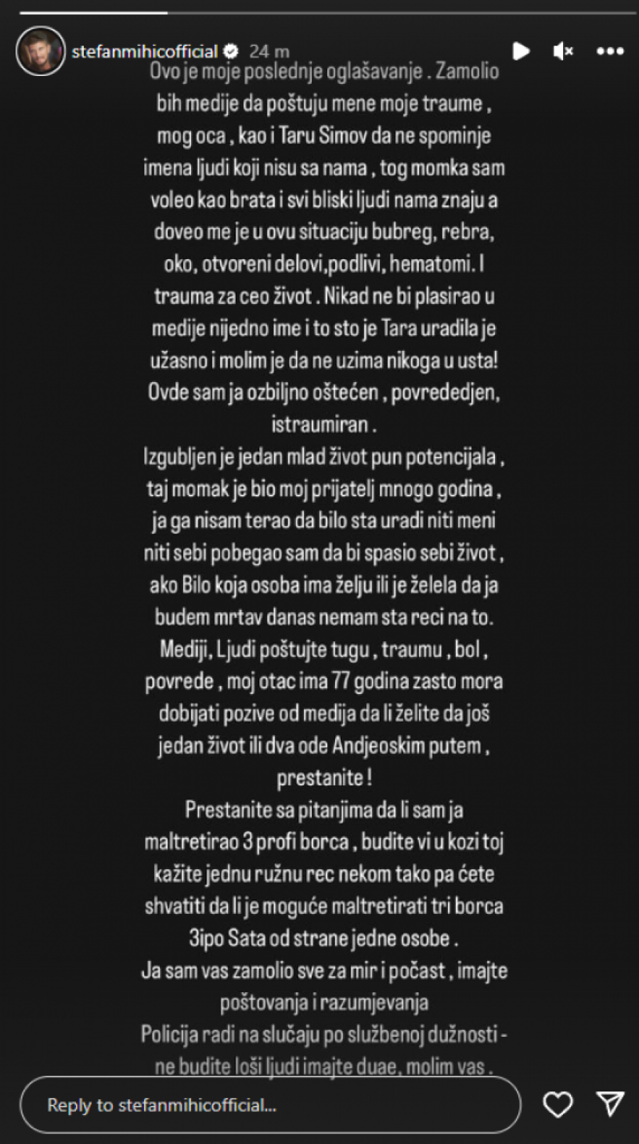 - Ovo je moje poslednje oglašavanje. Zamolio bih medije da poštuju mene, moje traume, mog oca, kao i Taru Simov da ne spominje imena ljudi koji nisu sa nama. Tog momka sam voleo kao brata i svi bliski ljudi nama znaju, a doveo me je u ovu situaciju bubreg, rebra, oko, otvoreni delovi, podlivi, hematomi i trauma za ceo život. Nikad ne bih plasirao u medoje nijedno ime i to što je Tara uradila je užasno i molim je da ne uzima nikoga u usta. Ovde sam ja ozbiljno oštećen, povređen, istraumiran. Izgubljen je jedan mladi život pun potencijala, taj momak je bio moj prijatelj mnogo godina, ja ga nisam terao da bilo pta uradi niti meni, niti sebi, pobeogao sam da bih sebi spasio život. Ako bilo koja osoba ima želju ili je želela da ja budem mrtav danas, nemam reči na to. Mediji, ljudi, poštujte tugu, traumu, bol, povrede. Moj otac ima 77 godina, zašto mora da dobija pozive od medija, da li želite da jiš jedan život ode anđeoskim putem, prestanite! Prestanite sa pitanjima da li sam ja maltretirao tri profi borca, budite vi u koži toj, kažite jednu ružnu reč nekom, ćete shvaiti da li je moguće maltretirati tri profi borca, tri i po sata od strane jedne osobe. Ja sam vas zamolio sve za mir i počast, imajte poštovanja i razumevanja. Policija radi na slučaju po službenoj dužnosti, ne budite loši ljudi, imajte duše, molim vas - napisao je Stefan.