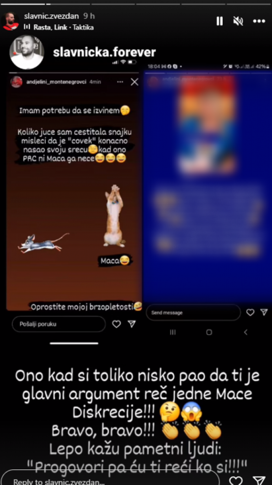 - Ono kad si toliko nisko pao da ti je glavni argument reč jedne Mace Diskrecije! Bravo, bravo! Lepo kažu pametni ljudi: ,,Progovori, pa ću ti reći ko si" - bio je tekst koji je Zvezdan podelio na svom Instagram profilu.