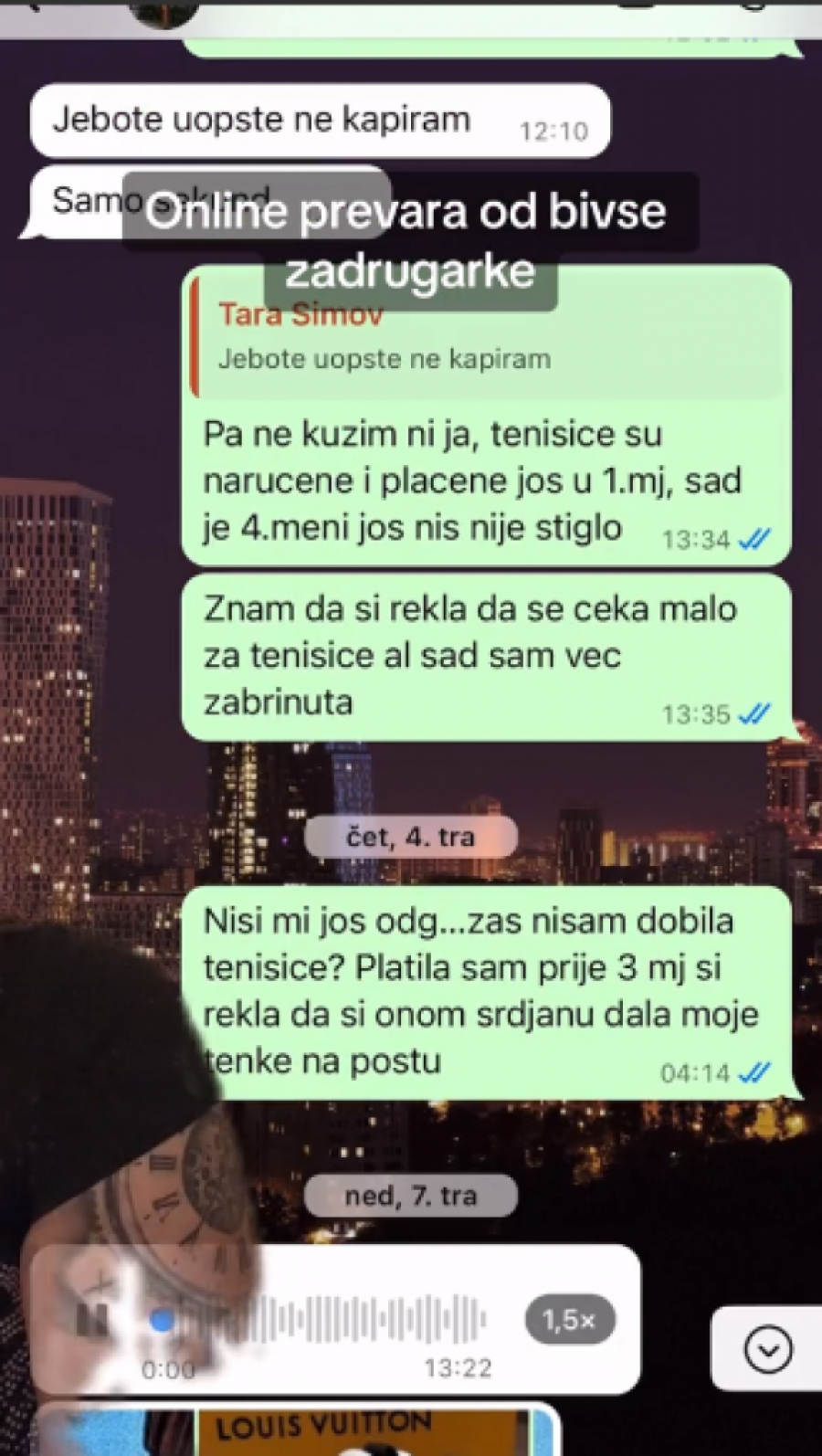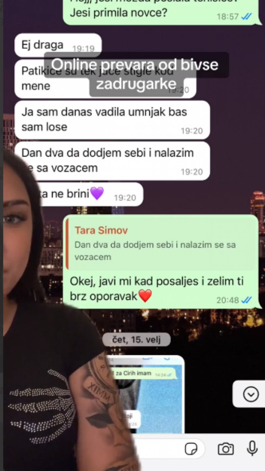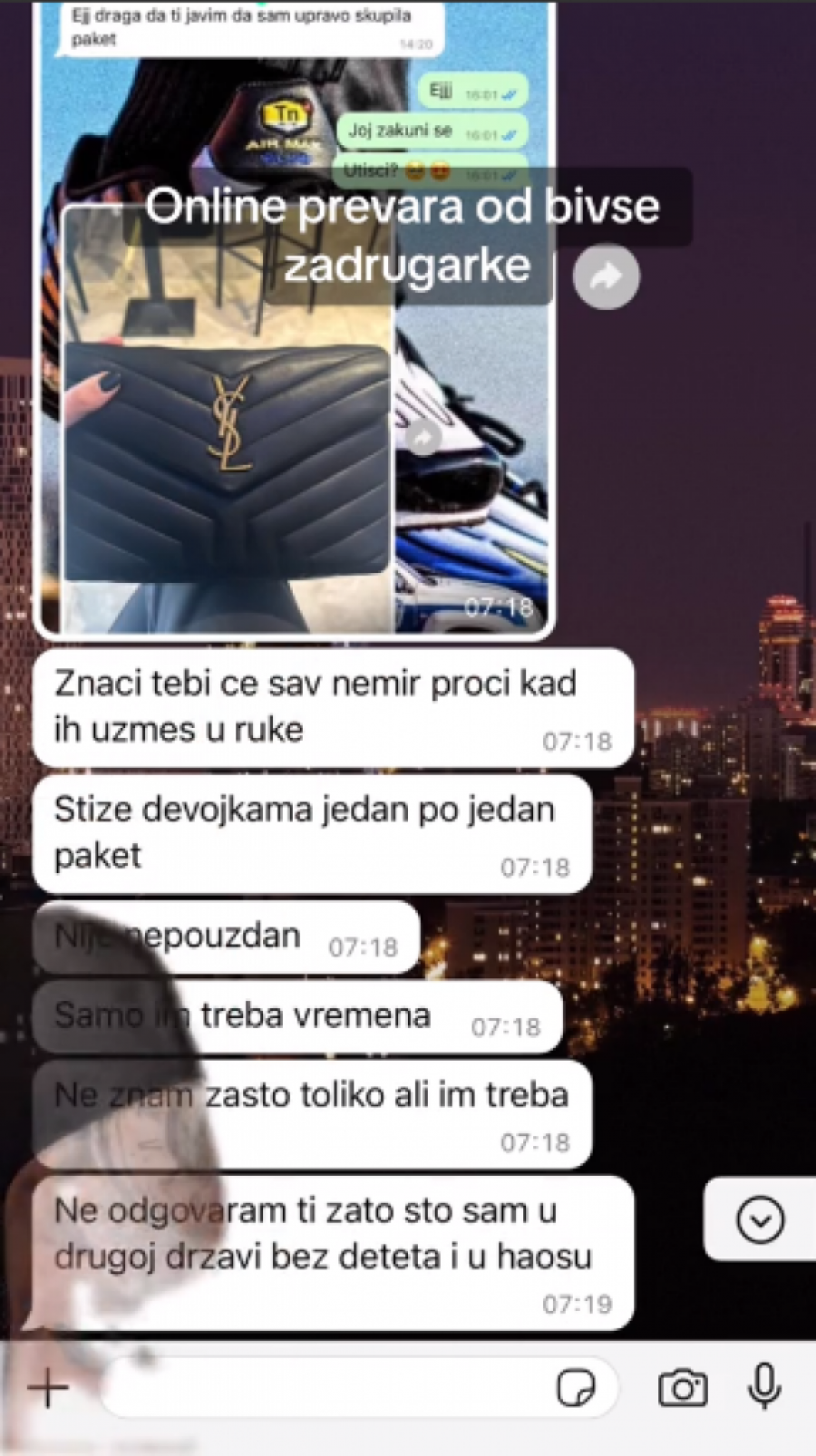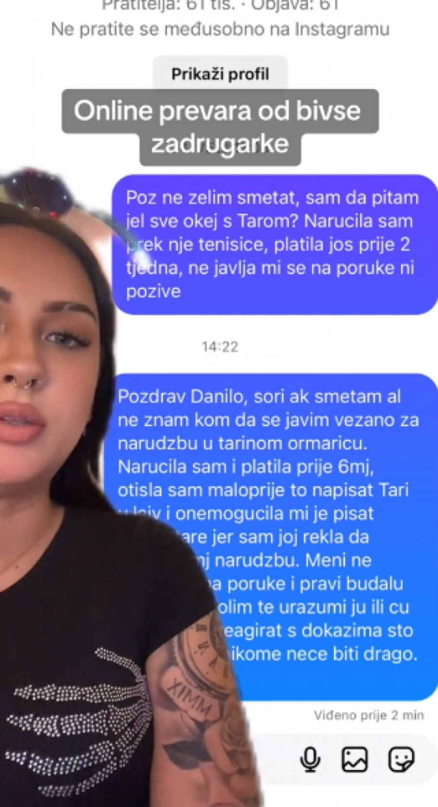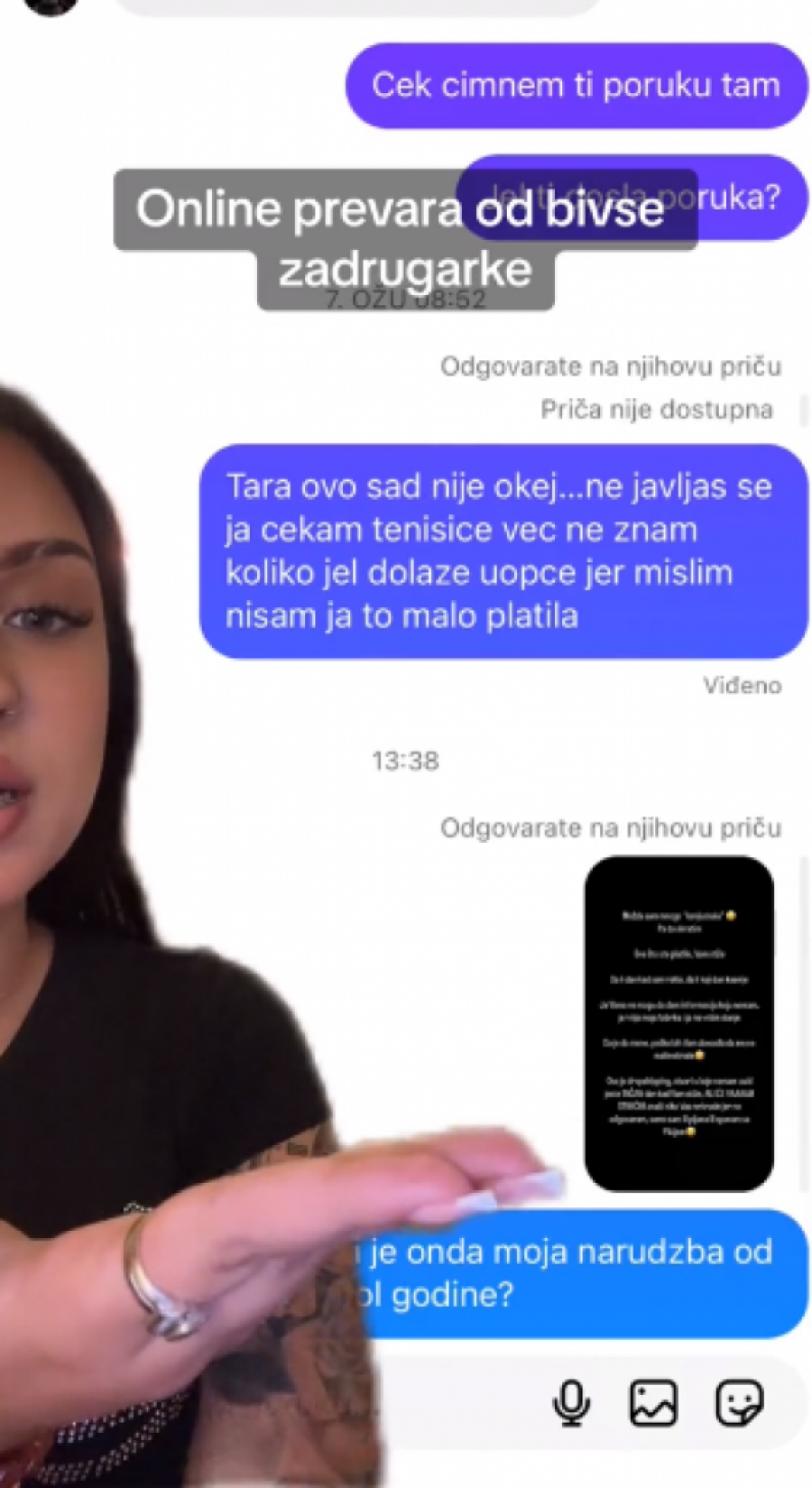 - Ovako, pozdrav svima koji me prate i koji će da vide ovaj video. Nisam mislila da ću morati da snimim ovakav video, jer nisam mislila da se radi o prevari. Ali zahtevam da mi se vrati novac. U pitanju je lepa svota novaca, koju sam dala za narudžbinu za ormarić jednoj bivšoj zadrugarki. Odlučila sam pre pola godine da naručim iz njenog ormarića, uplatila sam pare, međutim, tu je krenula rasprava, da mi je narudžbina poslata, da stiže, da kasni... Čak da je ona platila svojim novcem moju narudžbinu jer se moja narudžbina "zagubila". Da bi prestala da mi odgovara na poruke, dobila bih "seen" na svaku poruku, posle ni "seen". Danas sam joj napisala da čekam šest meseci svoju narudžbinu i dobila sam "mute". Ne bih htela da ovaj video traje sto godina, priložiću dokaze, koliko smem na TikTok-u. Imamo poruke koje sam slala ocu njenog deteta. Pa sam napisala i ovo danas kad je napisala da ne vara ljude i da stiže sve 7-10 dana... Evo pravdanja... Izgovori zašto nije poslato. Evo poruke na koje nisam dobila odgovor. Mislim da ste dovoljno čuli i videli, da znate čiji ormarić nije pouzdan. Ja ću samo reći jedno, ja na ovome ne stajem, ovo je samo početak. Znam kojim nadležnim ustanovama mogu, dobiću svoj novac nazad - rekla je ova influenserka.
