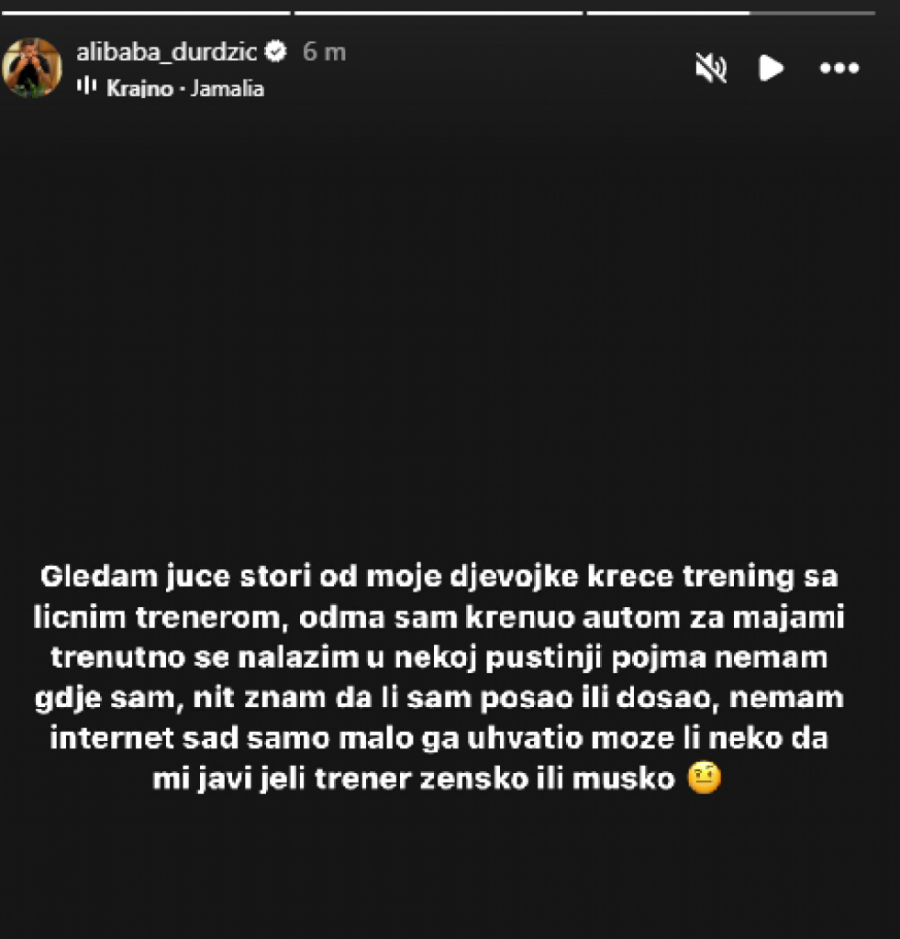 - Gledam juče stori od moje devojke, kreće treninge sa ličnim trenerom, odmah sam krenuo autom za Majami, trenutno se nalazim u nekoj pustinji, pojma nemam gde sam, nit znam da li sam pošao ili došao, enmam internet sad samo malo ga uhvatio, može li neko da mi javi da li je trener žensko ili muško - bio je uplašen Asmin.