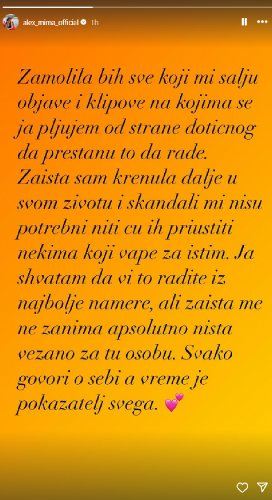- Zamolila bih sve koji mi šalju objave i klipove od strane dotičnog da prestanu to da rade. Zaista sam krenula dalje u svom životu i skandali mi nisu potrebni, niti ću ih priuštiti nekima koji vape za tim. Ja shvatam da to radite iz najbolje namere, ali zaista me ne zanima apsolutno ništa vezano za tu osobu. Svako govori o sebi, a vreme je najbolji pokazatelj svega - napisala je Aleks putem svohg profila na društvenoj mreži Instagram.