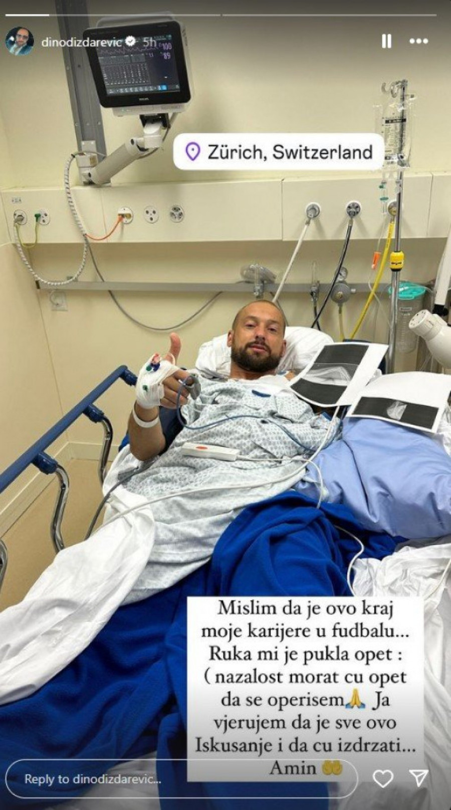 - Mislim da je ovo kraj moje karijere u fudbalu... Ruka mi je pukla opet (nažalost moraću opet da se operišem). Ja verujem da je sve ovo iskušenje i da ću izdržati - napisao je Dino, izazivajući veliku zabrinutost među svojim pratiocima.