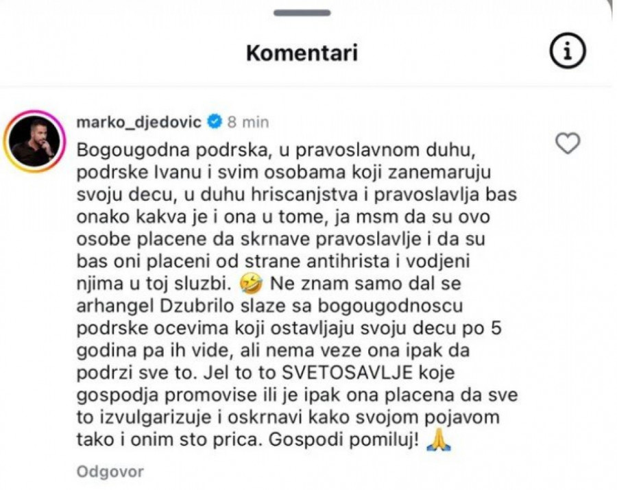 - Bogougodna podrška, u pravoslavnom dugu, podrške Ivanu i svim osobama koji zanemaruju svoju decu, u duhu hrišćanstva i pravoslavlja baš onako kakva je i ona u tome...Je l' to to svetoslavlje koje gospođa promoviše ili je ipak ona plaćena da sve to izvulgarizuje i oskrnavi kako svojom pojavom tako i onim što priča. Gospodi pomiluj - napisao je Đedović između ostalog na Instagramu.