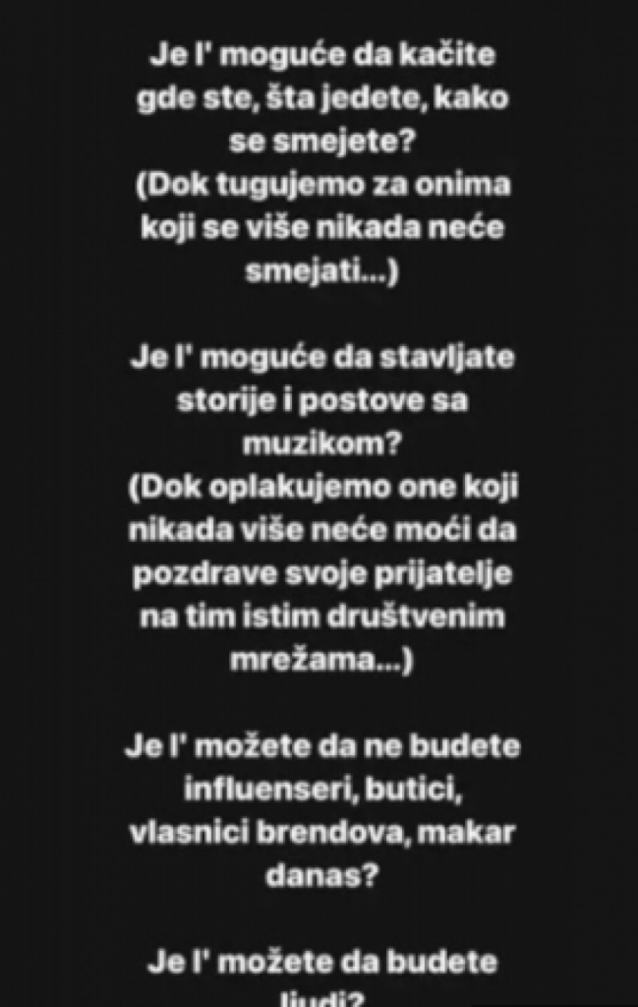 - Je l' moguće da kačite gde ste, šta jedete, kako se smejete? Dok tugujemo za onima koji se više nikada neće smejati... Je l' moguće da stavljate storije i postove sa muzikom? Dok oplakujemo one koji nikada više neći moći da pozdrave svoje prijatelje na tim istim društvenim mrežama... Je l' možete da ne budete influenseri, butici, vlasnici brendova, makar danas? Je l' možete da budete ljudi? Makar danas - napisala je Dušica na svom Instagram profilu.