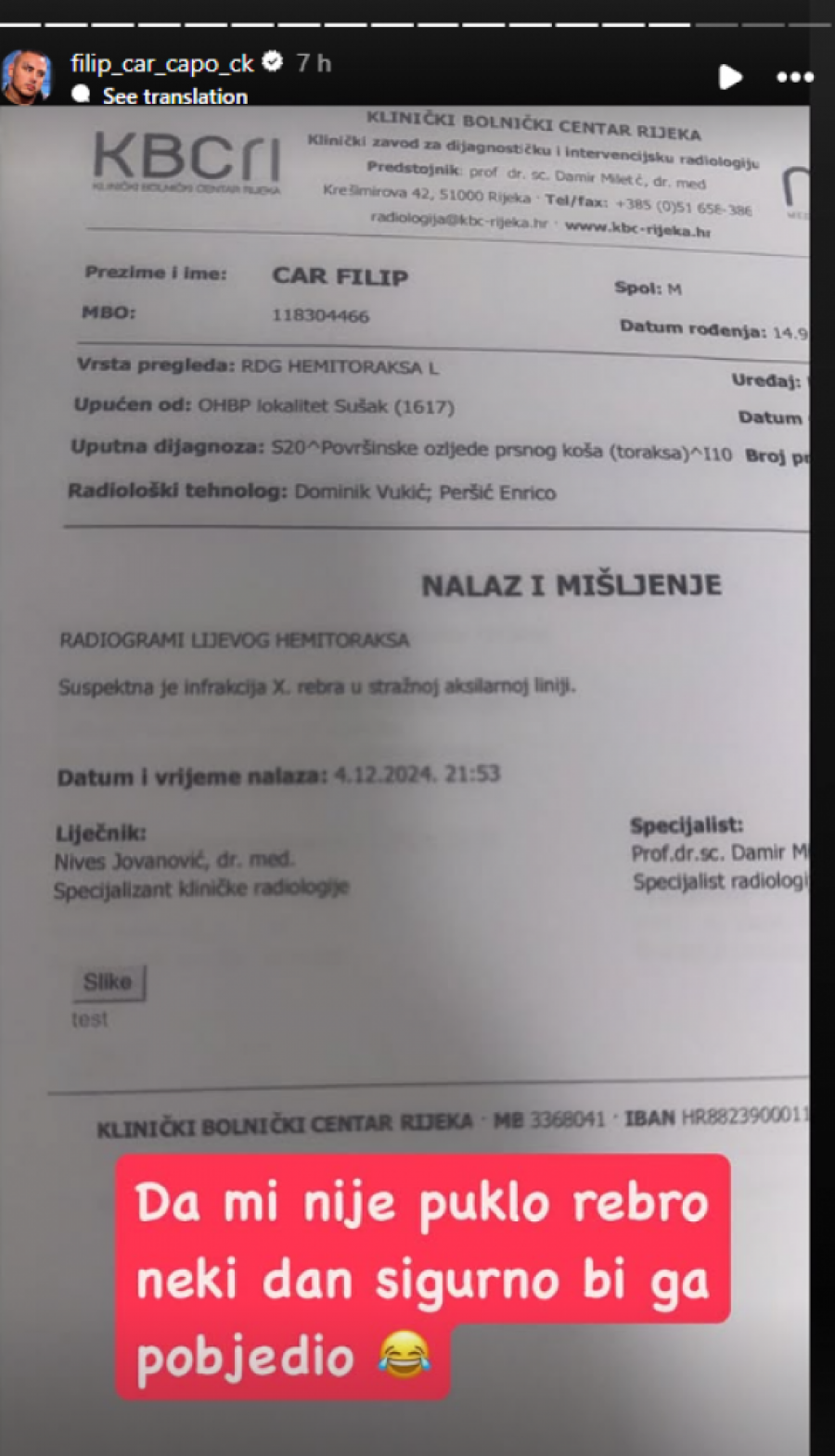 Filip se kasnije oglasio na Instagramu, objavio snimke povreda po licu, ali i izveštaj od lekara. Filip Car je bio siguran da bi pobedio, ali je imao mali peh, jer mu je samo nekoliko dana ranije, kako tvrdi, rebro puklo, zbog čega je imao otežavajuću okolnost.