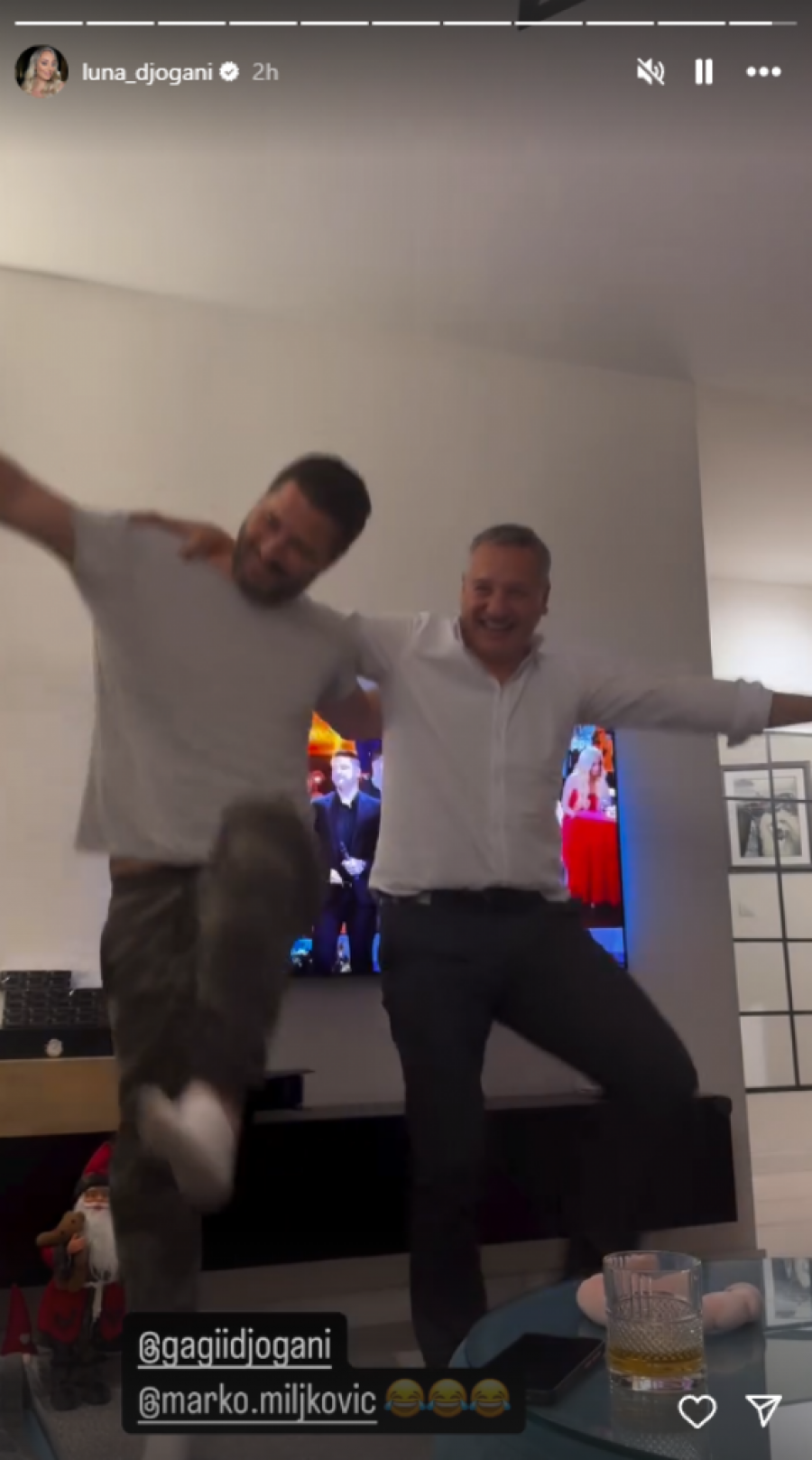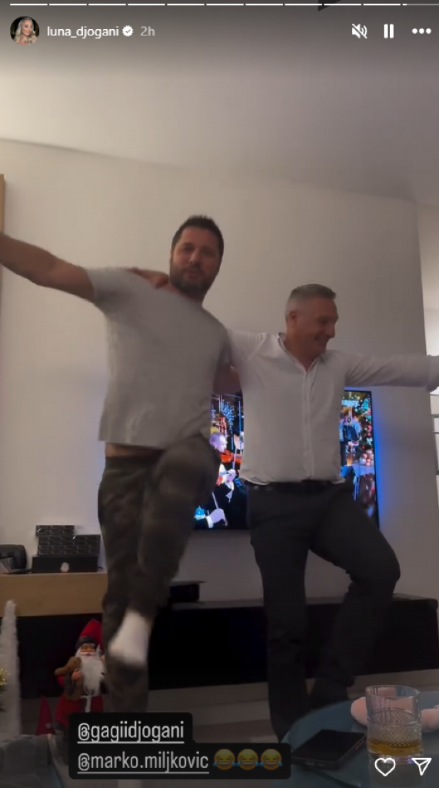 Luna je pokazala kako se mala Mia veseli i raduje poklonima, dok su se roditelji opustili i uživali u trenucima zajedništva. Nakon što su deca zaspala, atmosfera je postala još opuštenija, a na stolu se našla čaša viskija koja je doprinela stvaranju prijatne atmosfere. Marko i Gagi su u jednom momentu počeli da igraju kolo, što je Luna zabeležila i podelila na društvenim mrežama.