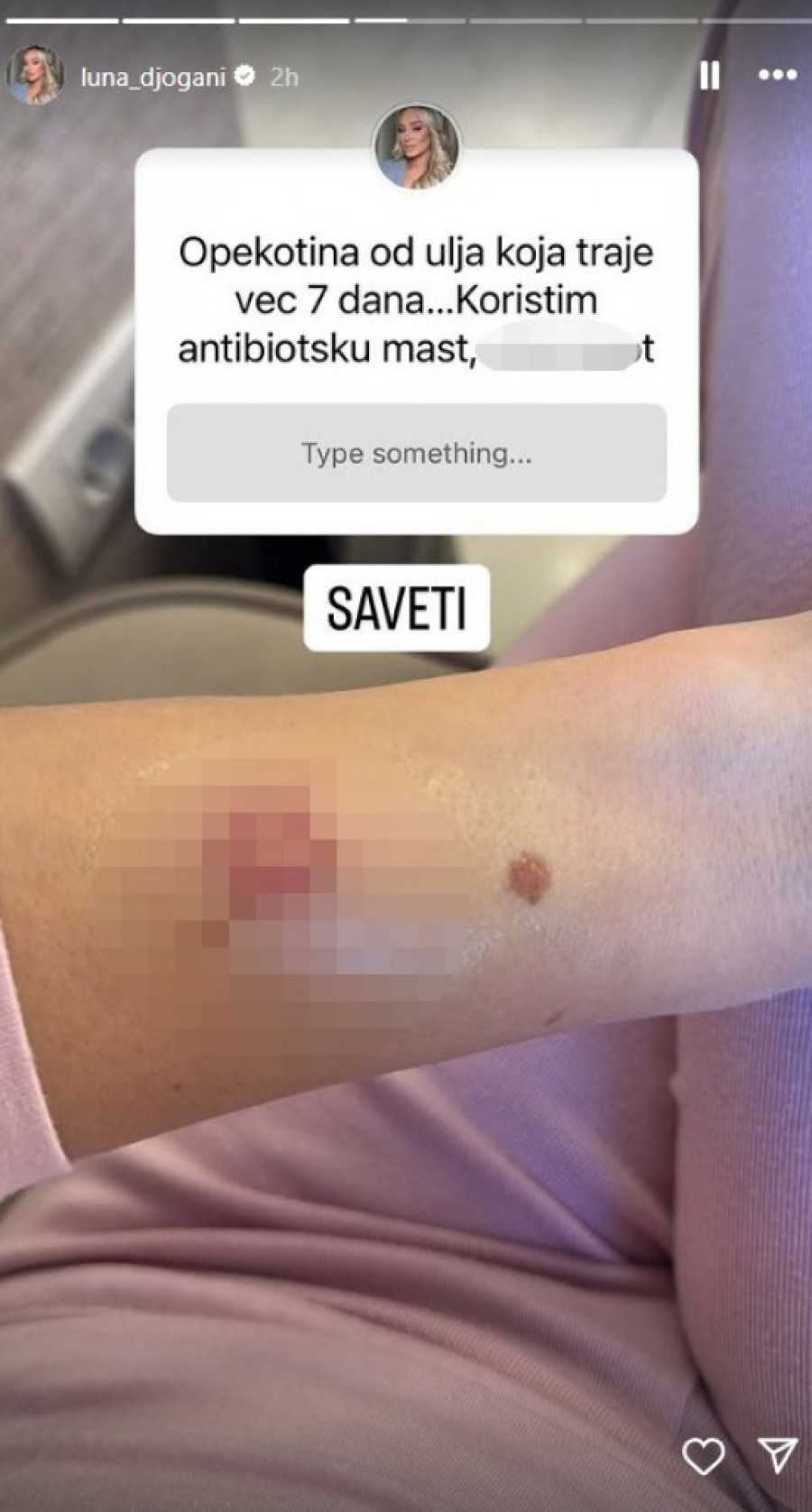 - Opekotina od ulja koja traje već 7 dana. Koristim antibiotsku mast - napisala je Luna i dodatno naglasila da joj je potreban savet u vezi sa nemilom situacijom.
