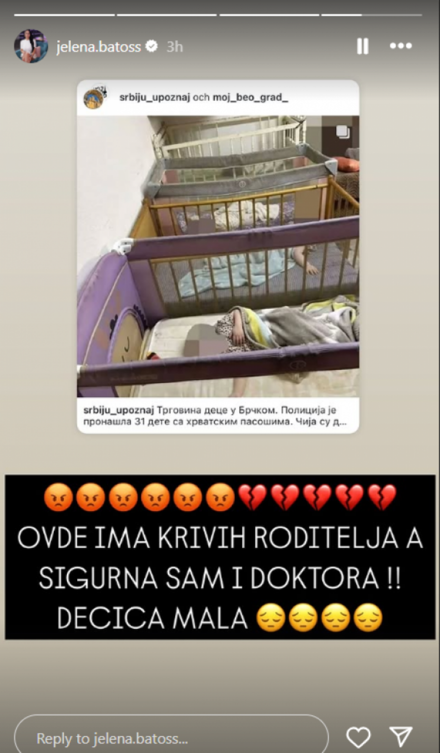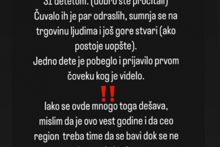 - Pošto vidim da mnogi nisu videli. Danas je u Brčkom pronađena kuća sa 31 detetom. Dobro ste pročitali! Čuvalo ih je par odraslih, sumnja se na trgovinu ljudima i još gore stvari, ako postoje uopšte. Jedno dete je pobeglo i prijavilo prvom čoveku kog je videlo. Iako se ovde mnogo toga dešava, mislim da je ovo vest godine i da ceo region treba time da se bavi dok se ne istera do kraja. Deluje mi da se tome ne posvećuje dovoljno pažnje. Ovo je moj "doprinos", a vi guglajte i delite dalje - podelila je Jelena u Instagram priči, dok je u sledećoj dodala i potresnu fotografiju pomenute dece i svoj sud o svemu tome: