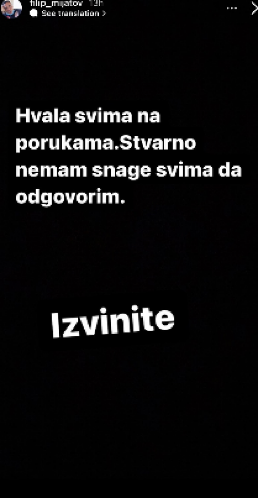Filip se oglasio putem društvenih mreža, izražavajući zahvalnost svima koji su mu slali poruke podrške. "Hvala svima na porukama. Stvarno nemam snage svima da odgovorim. Izvinite," poručio je Filip, pokazujući koliko ga je ova situacija emotivno pogodila.