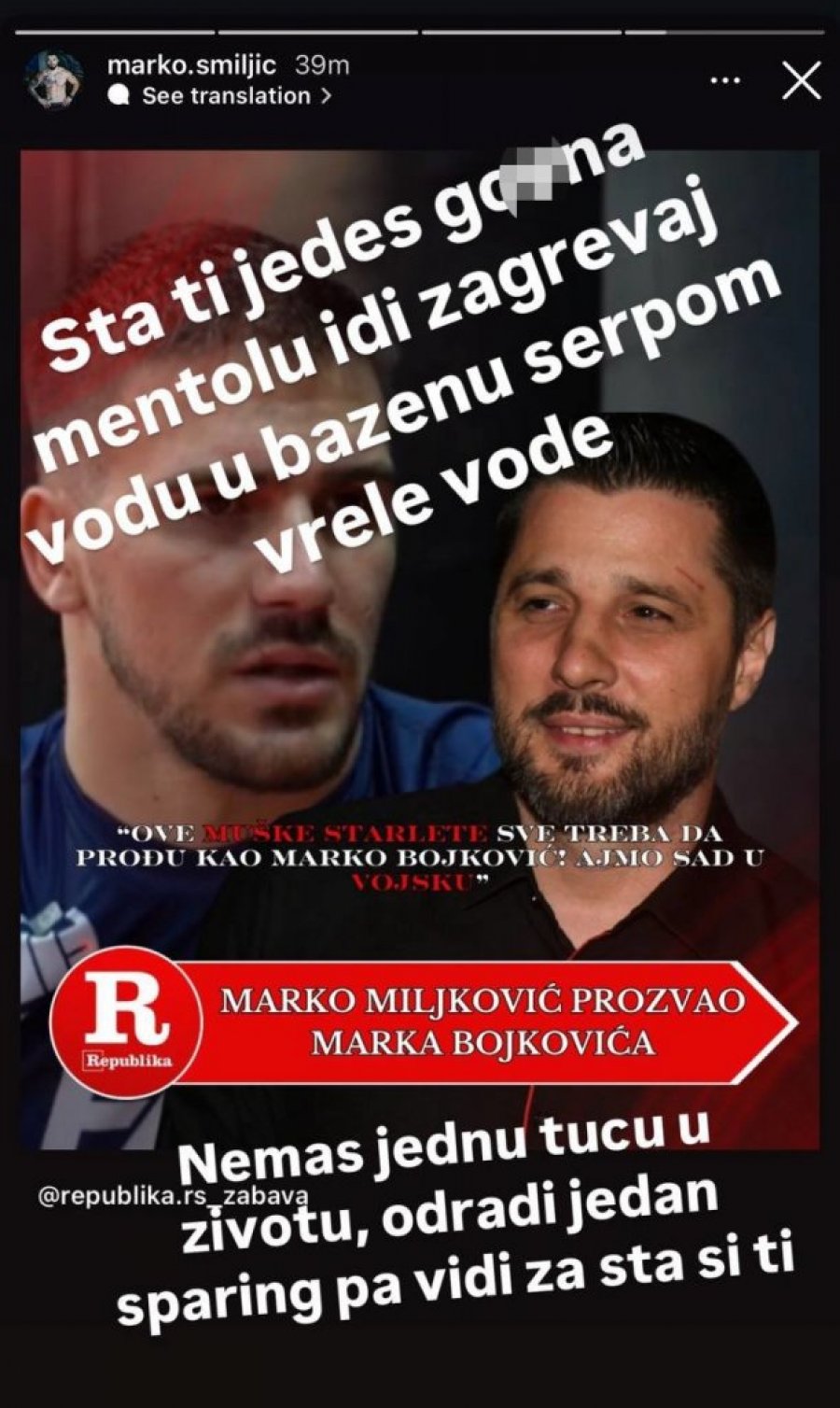 Meč su pratile i brojne javne ličnosti, a među njima se izdvojio Marko Miljković, poznata rijaliti zvezda, koji je na svom Instagram storiju uputio oštru poruku na račun poraženog Bojkovića. Nije štedeo reči, već ga je nazvao "muškom starletom", sugerišući da bi trebalo da ode u vojsku kako bi naučio šta je disciplina i borba.