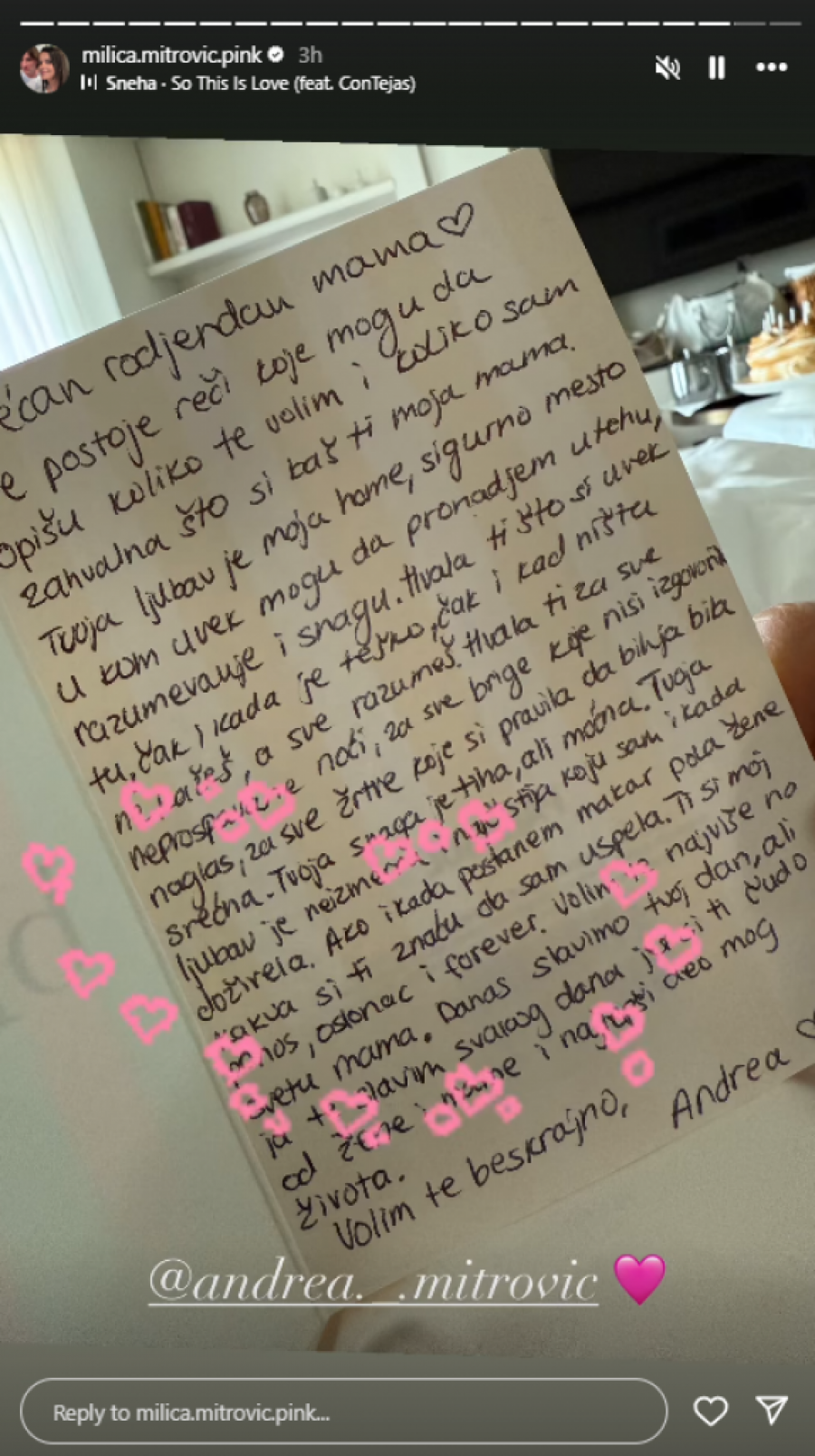 Ono što je posebno zanimljivo jeste da su Milica i njena porodica u martu boravila u Londonu, gde su ćerke Andrea i Kristina priredile iznenađenje za svoju majku. Naime, u Britaniji su je obradovale sa dve torte, čime su ulepšale proslavu njenog rođendana. Andrea je u svojoj čestitki izrazila duboku zahvalnost i ljubav prema majci, govoreći o njenoj neprocenjivoj podršci i snazi. Njena reči su bile dirljive: