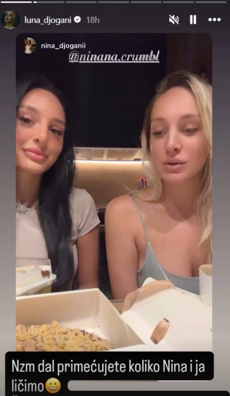 Multimedijalna ličnost, influenserka i bivša rijaliti zvezda Luna Đogani ponovo je obradovala svoje pratioce objavom iz privatnog života. Ovoga puta u centru pažnje našla se njena sestra Nina, sa kojom je Luna podelila kratak, ali veoma upečatljiv snimak. Na storiju koji je objavljen na njenom Instagram profilu, sestre sede zajedno, u opuštenoj atmosferi, ispred kutija sa hranom, dok pričaju i snimaju se.