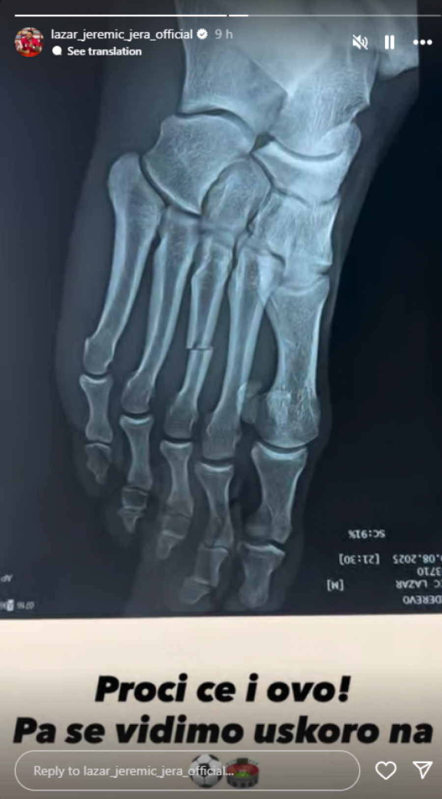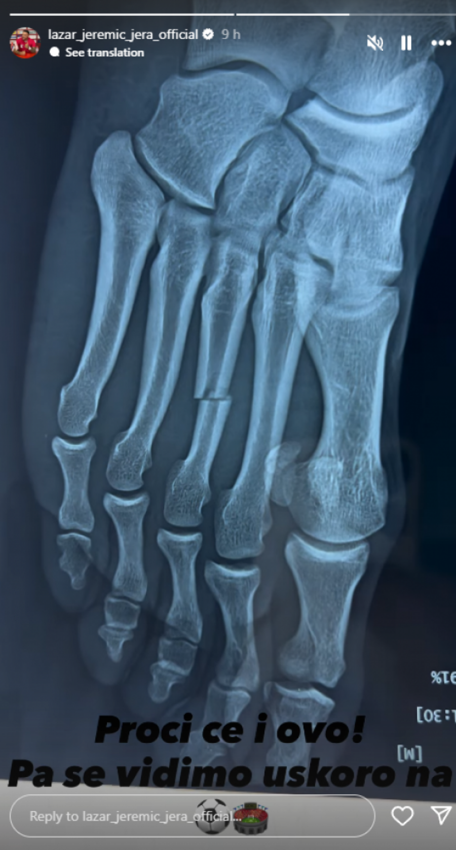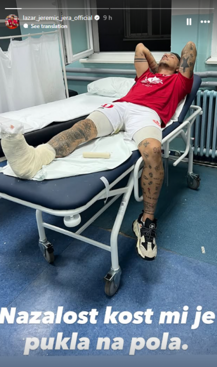 Bivši rijaliti učesnik Lazar Jeremić nedavno je izazvao pažnju svojih pratilaca na Instagramu objavivši snimak iz bolnice. Na snimku se vidi kako leži na bolničkom krevetu sa nogom u gipsu, što je odmah izazvalo brigu među njegovim fanovima. Jeremić je u opisu snimka objasnio da mu je kost pukla na dva dela, što će značiti da će njegov oporavak trajati duže od očekivanog. Ova situacija nije nova za njega, jer je već ranije imao operaciju zbog koje je dugo odsustvovao iz svoje fudbalske karijere.