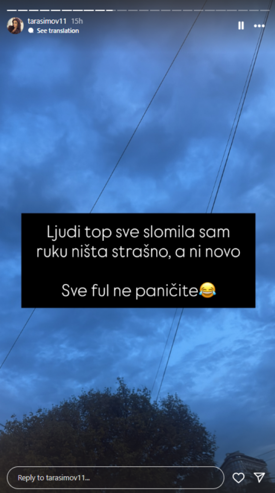 - Ljudi, top sve, slomila sam ruku, ništa strašno, a ni novo. Sve ful, ne paničite - poručila je Tara.