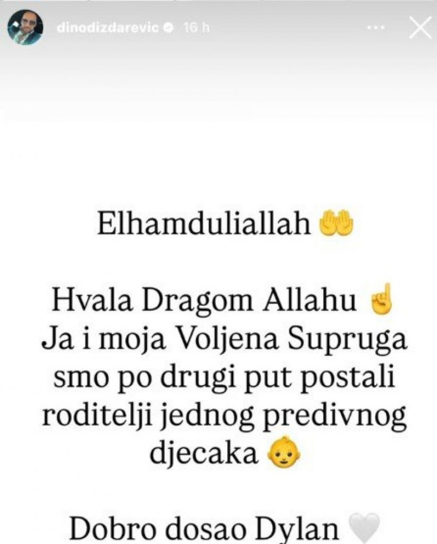 Bivši zadrugar i fudbaler Dino Dizdarević postao je otac drugi put, čime je obogatio porodicu za još jednog dečaka. Ova srećna vest dolazi nakon što je pre nepune dve godine dočekao prvog sina. Njegova supruga se porodila i na svet donela drugog sina, a Dino nije mogao da sakrije radost zbog ovog važnog trenutka u njihovim životima.