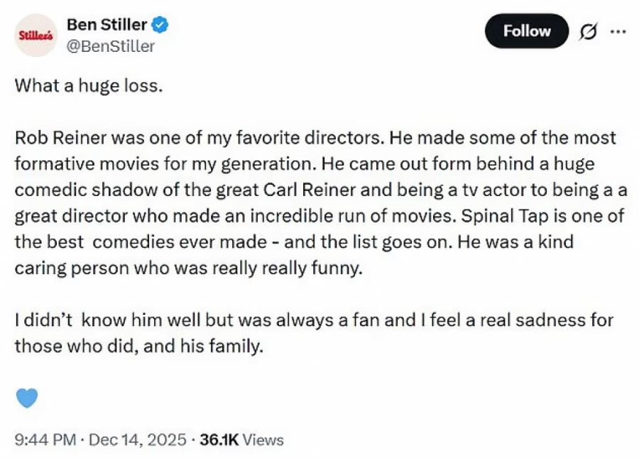 U nedelju uveče, vest o šokantnoj smrti holivudske legende Roba Reinera i njegove supruge Mišel potresla je svet. Policija u Los Anđelesu istražuje ovaj slučaj kao ubistvo, a reakcije iz industrije zabave su se samo nizale. Glumac i reditelj Ben Stiler, koji je otvoreno govorio o tome koliko je Reiner uticao na njegovu karijeru, nazvao je njihovu smrt "velikim gubitkom". Stiler je dodao da je Rob Reiner bio jedan od njegovih omiljenih reditelja, koji je stvorio neka od najznačajnijih dela za njegovu generaciju, ističući film "Spinal Tap" kao jednu od najboljih komedija svih vremena.