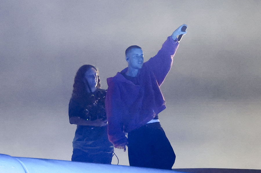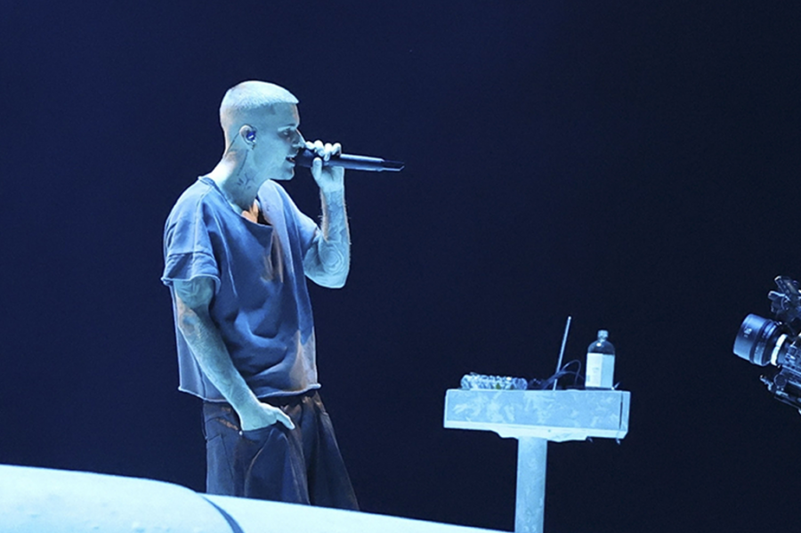 Pevač se na sceni pojavio u opuštenom izdanju - kratke pantalone, dukserica sa kapuljačom i sunčane naočare - dok je koncept nastupa bio potpuno neuobičajen. Tokom performansa, Biber je uključio lajv prenos, komunicirao sa publikom putem četa i tražio od fanova da predlože sledeće pesme, uz povremeno puštanje mimova na sopstveni račun.